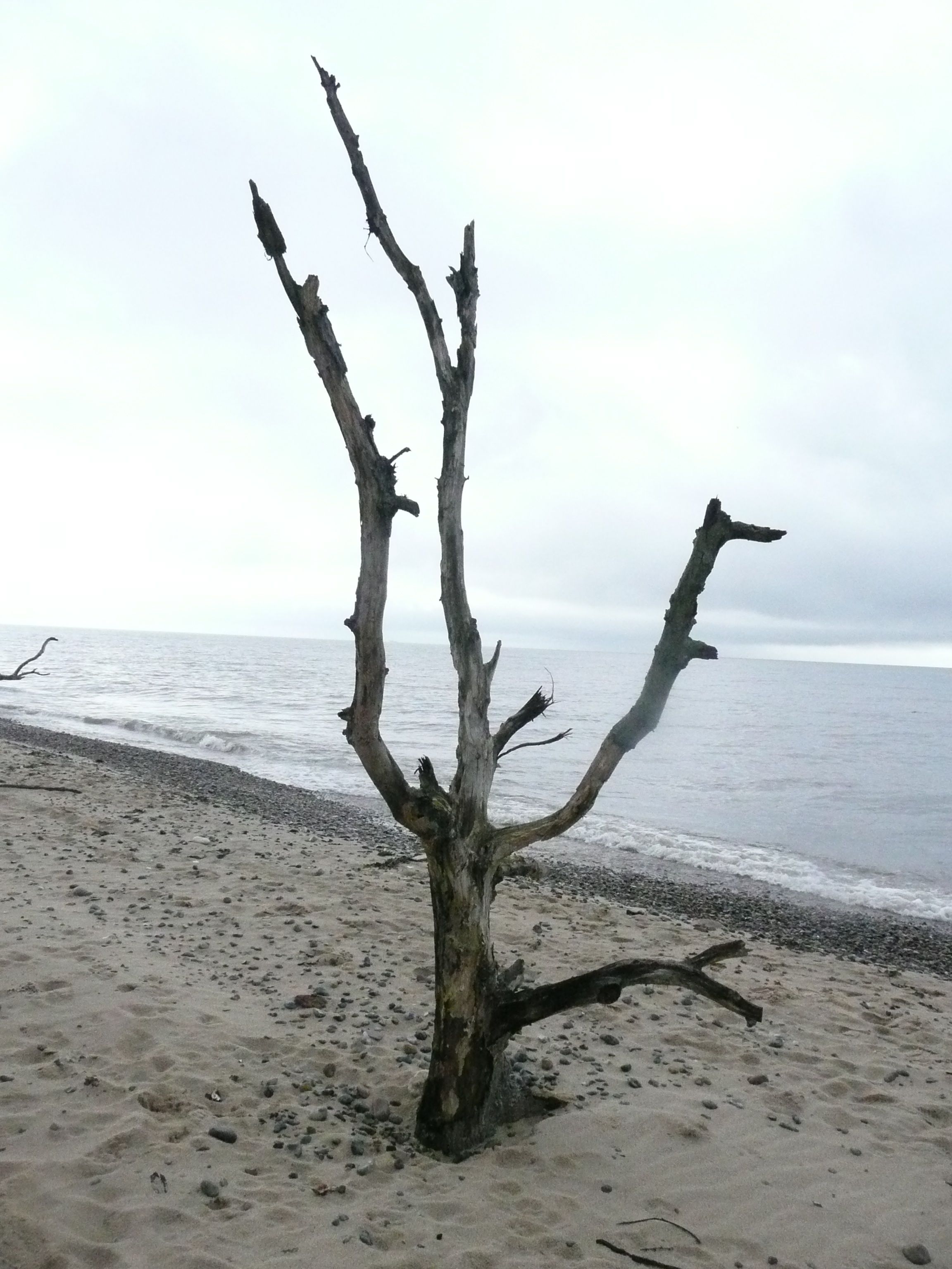 Caught up in the sight of the stark dead trees on the beach we miss the first drops of rain, which quickly become a heavy downpour. No shelter in sight I carry my rucksack close to my body in an attempt to protect my camera and iphone, feeling like a refugee carrying a child away from danger. I back up under a dead tree, bent double under a low branch, like a cow sheltering from the storm.