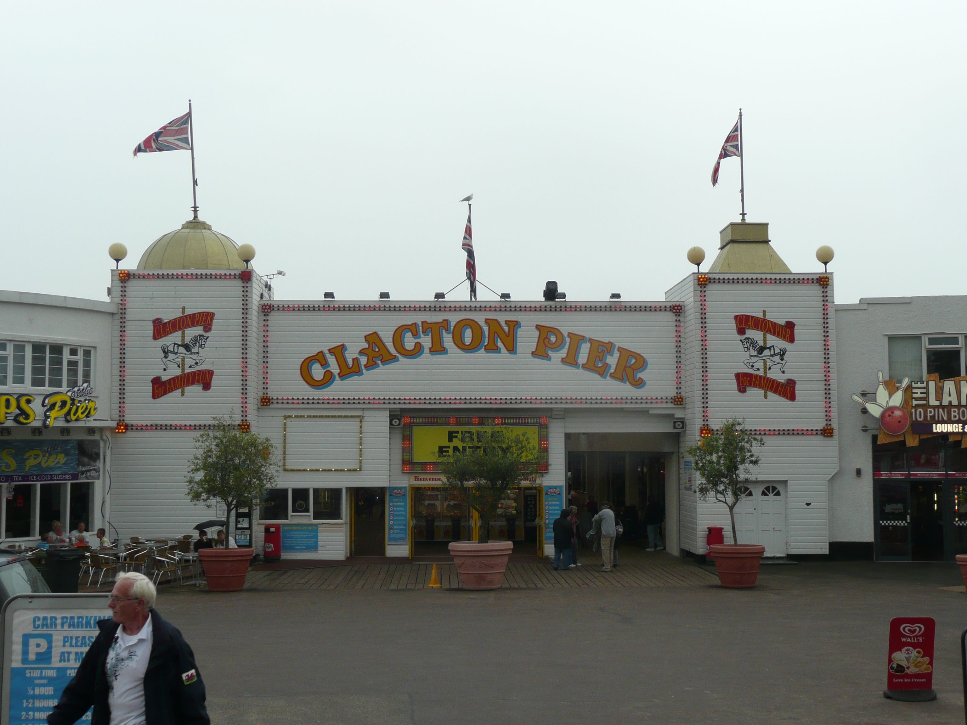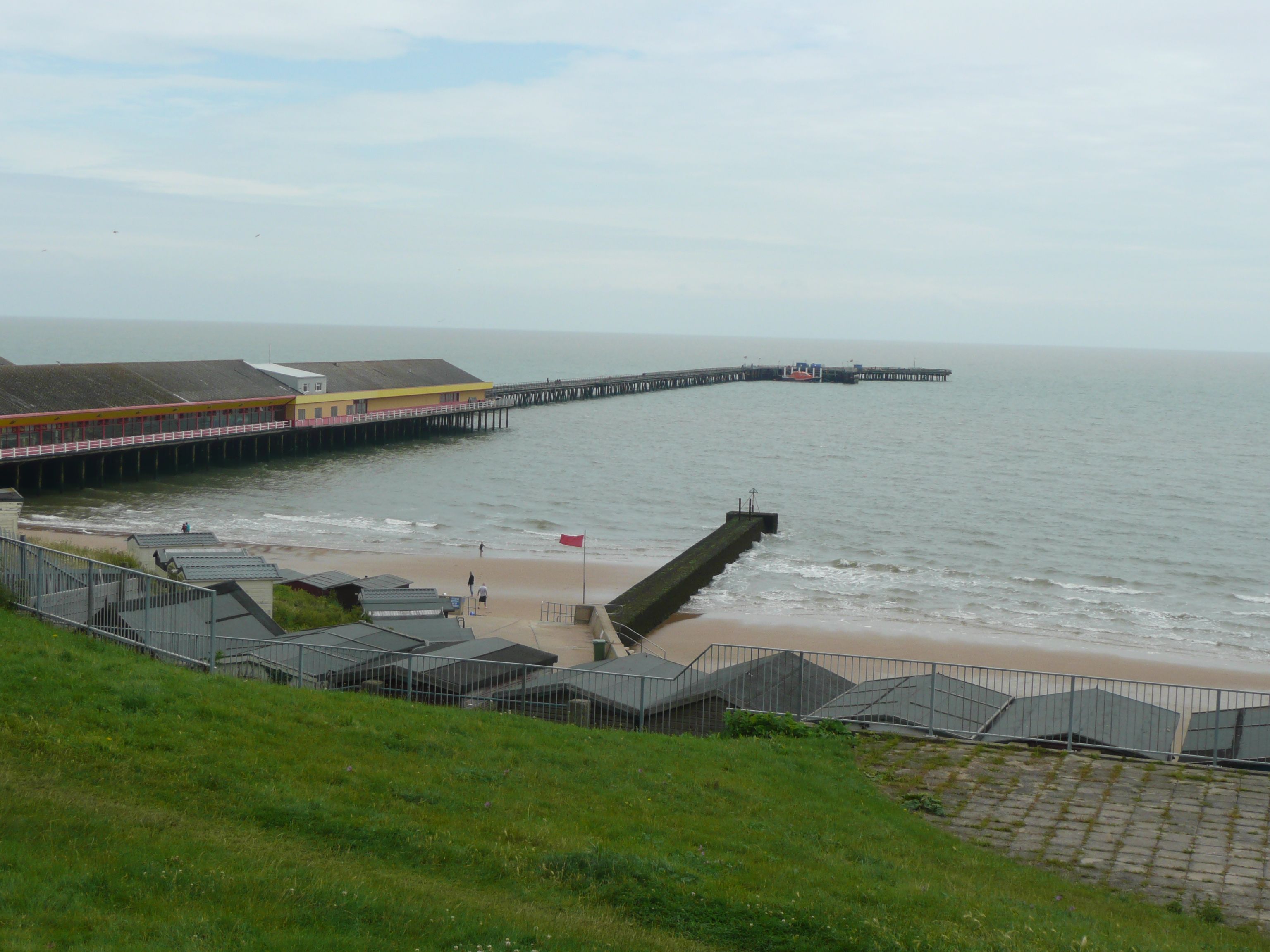 On the tarmac to Walton on the Naze and its pier snaking out to sea.Miles and miles of beach huts through Frinton, easy sand walking at low tide, groups of children screaming at crabs and then the long concrete sea wall to Clacton.