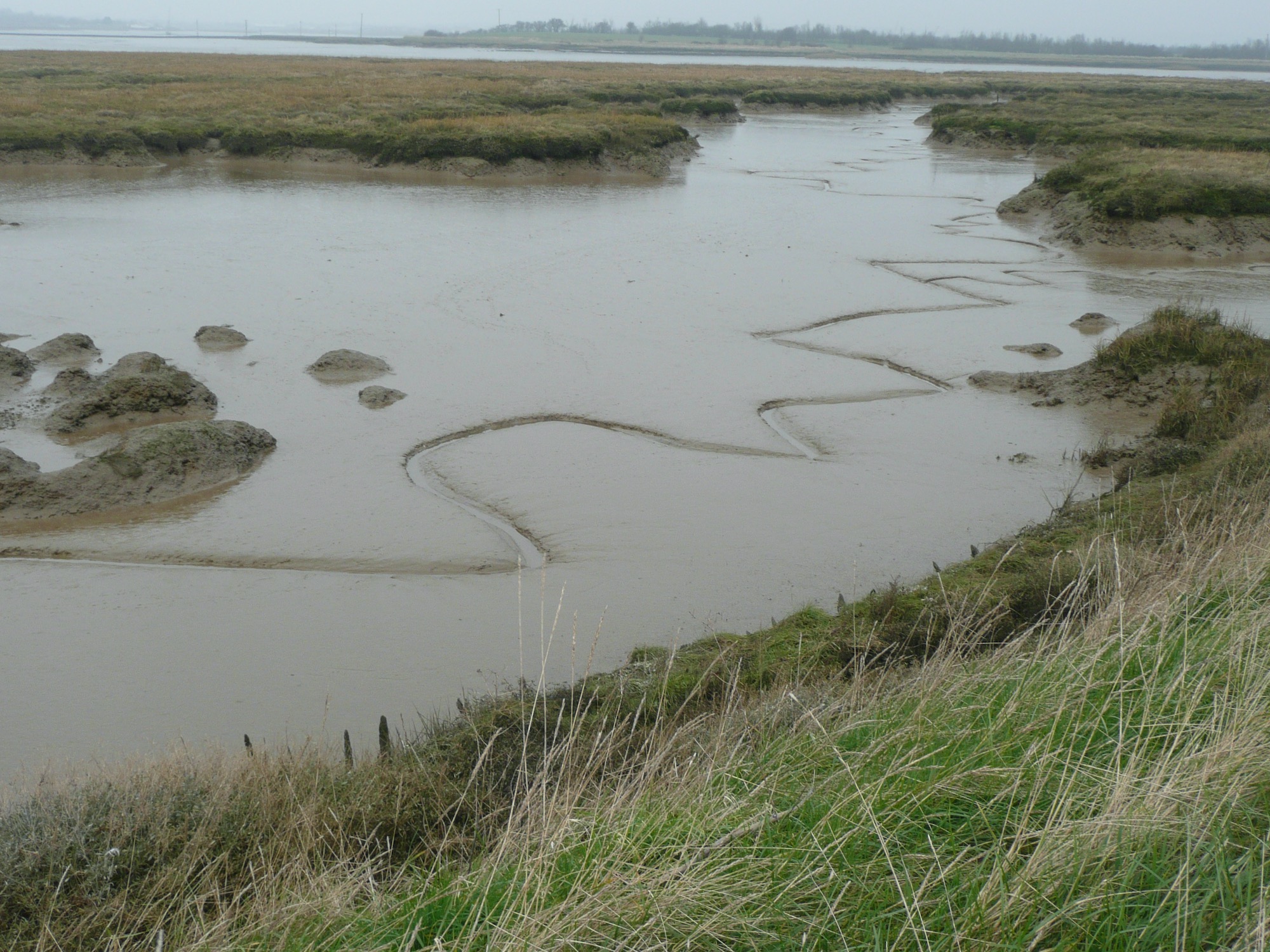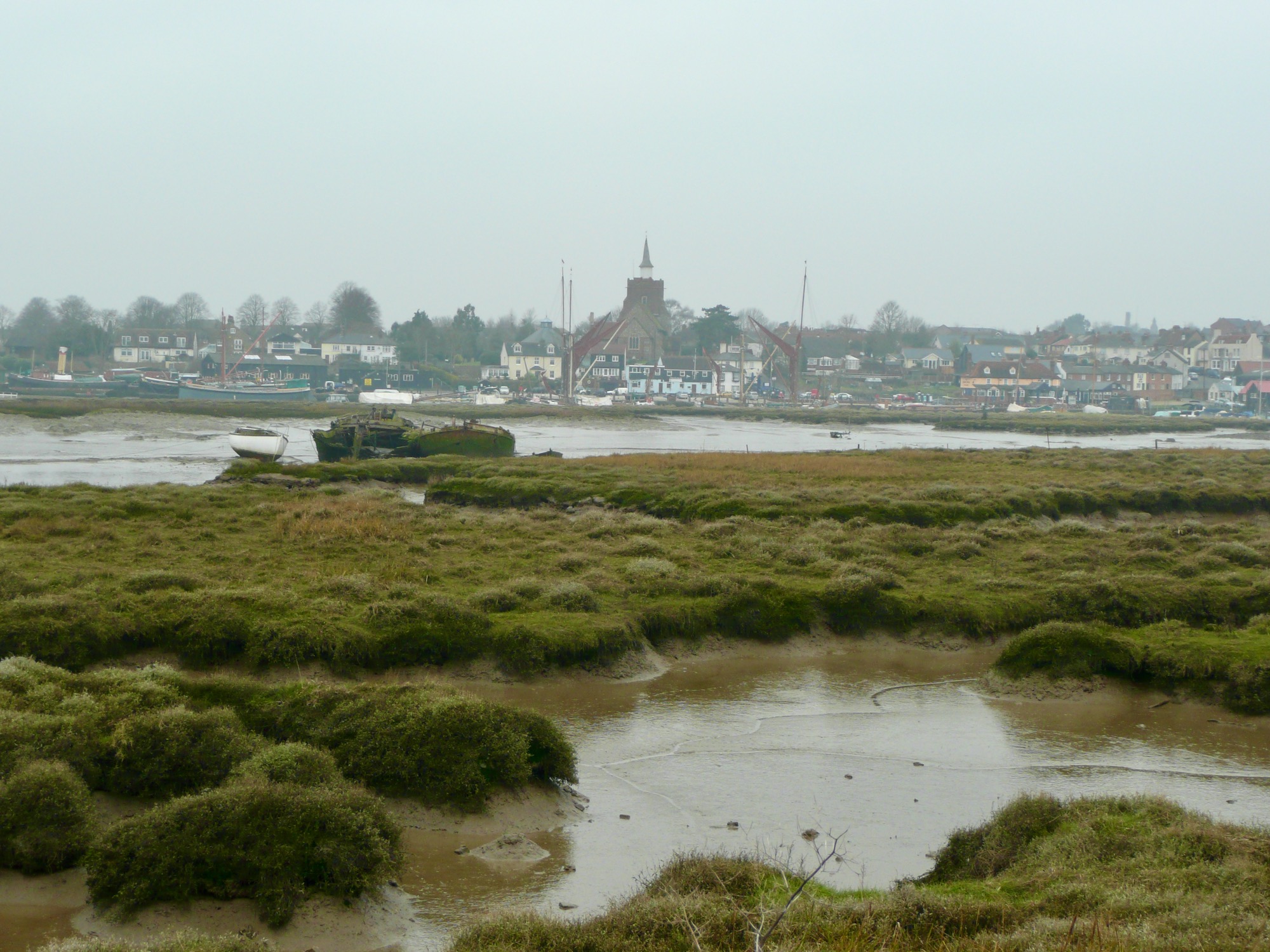 Gradually, a familiar landscape unfolds, the grassy sea wall, mud flats, and salt marshes, mossy teeth of crumbling wrecks – peace and quiet apart from the wind in my left ear and bird song.