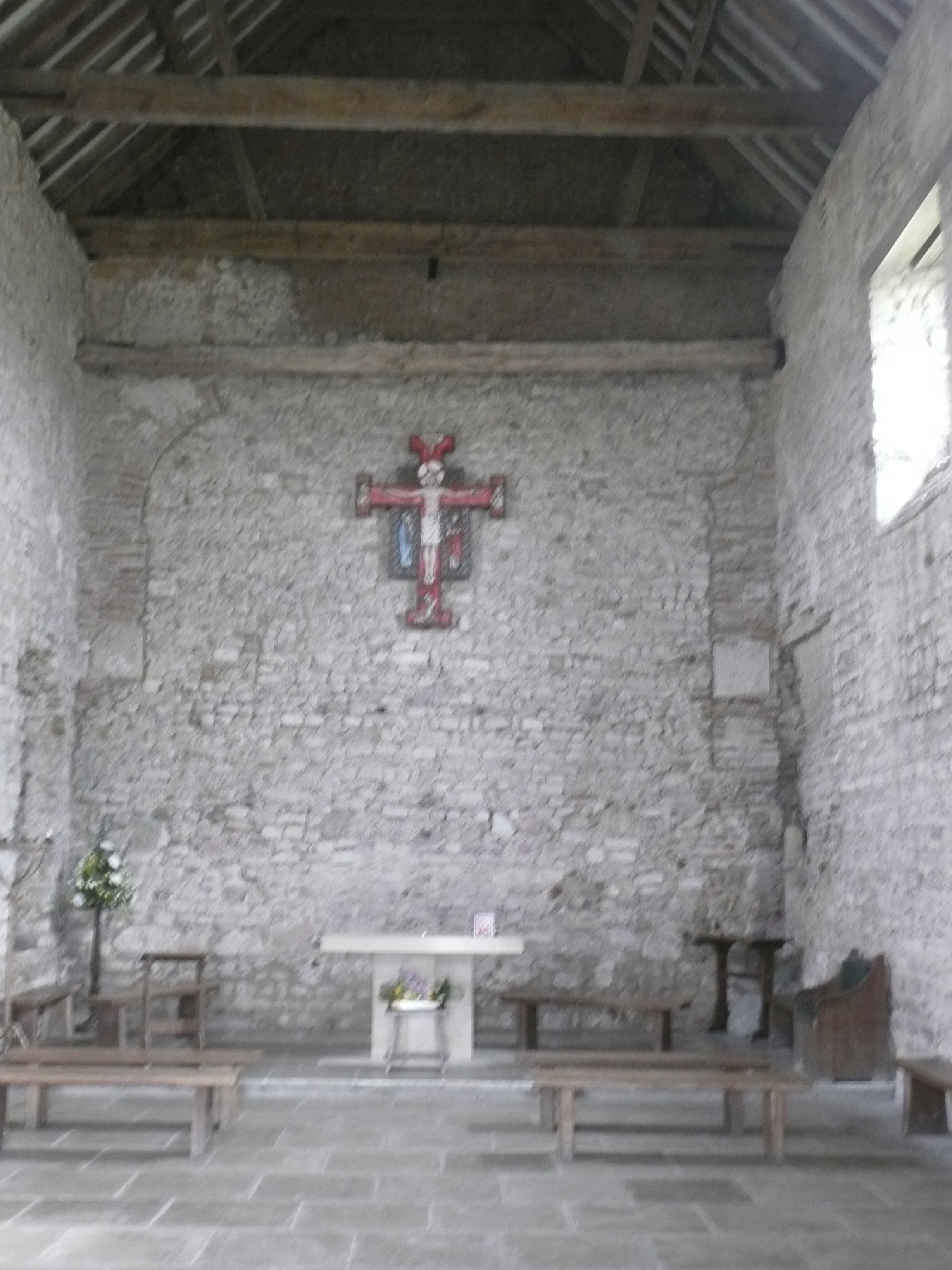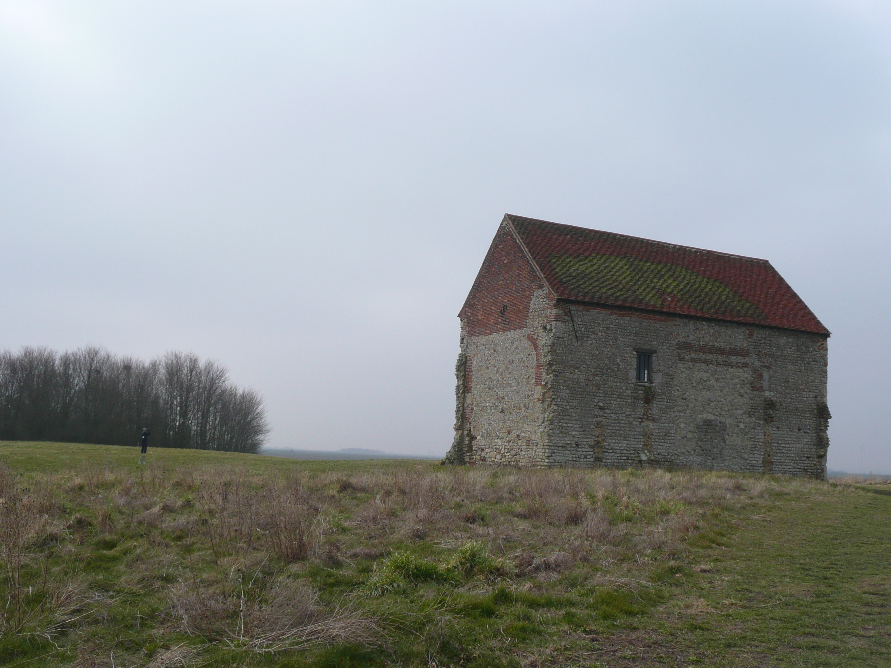 Soon I am out on the familiar sea wall which now forms part of St Peter’s Way – this will take me to St Peter’s Chapel and then inland to Tillingham. After a few miles of bleak mudflats and marshes I am presented with an enticing turn off right through a small wood and quickly find myself walking down the “main street” of a community of wooden houses of all shapes and sizes. Feeling a little awkward to have ended up in someone’s back yard, I take a few surreptitious photos and walk on and up to the chapel, where I read on an information board that the buildings belong to the Othona Christian community.