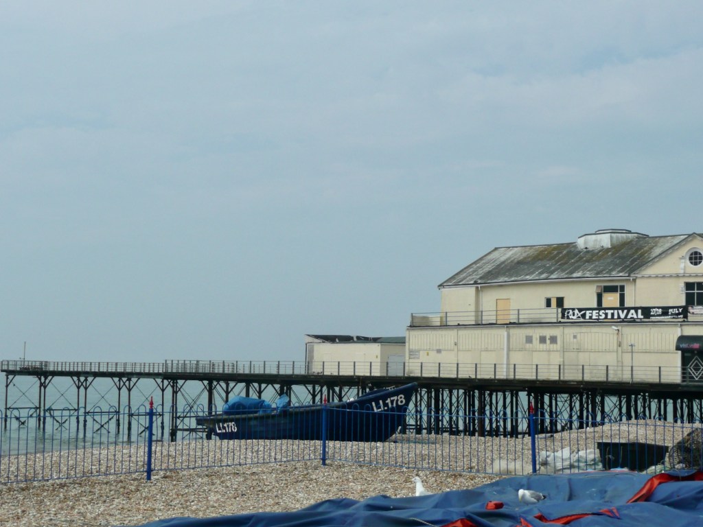 And he’s right – half an hour later I am on firm sand, entranced by the sight of the fluted roof of the leisure centre in the distance and when I get to Bognor, very disappointed by the pier.