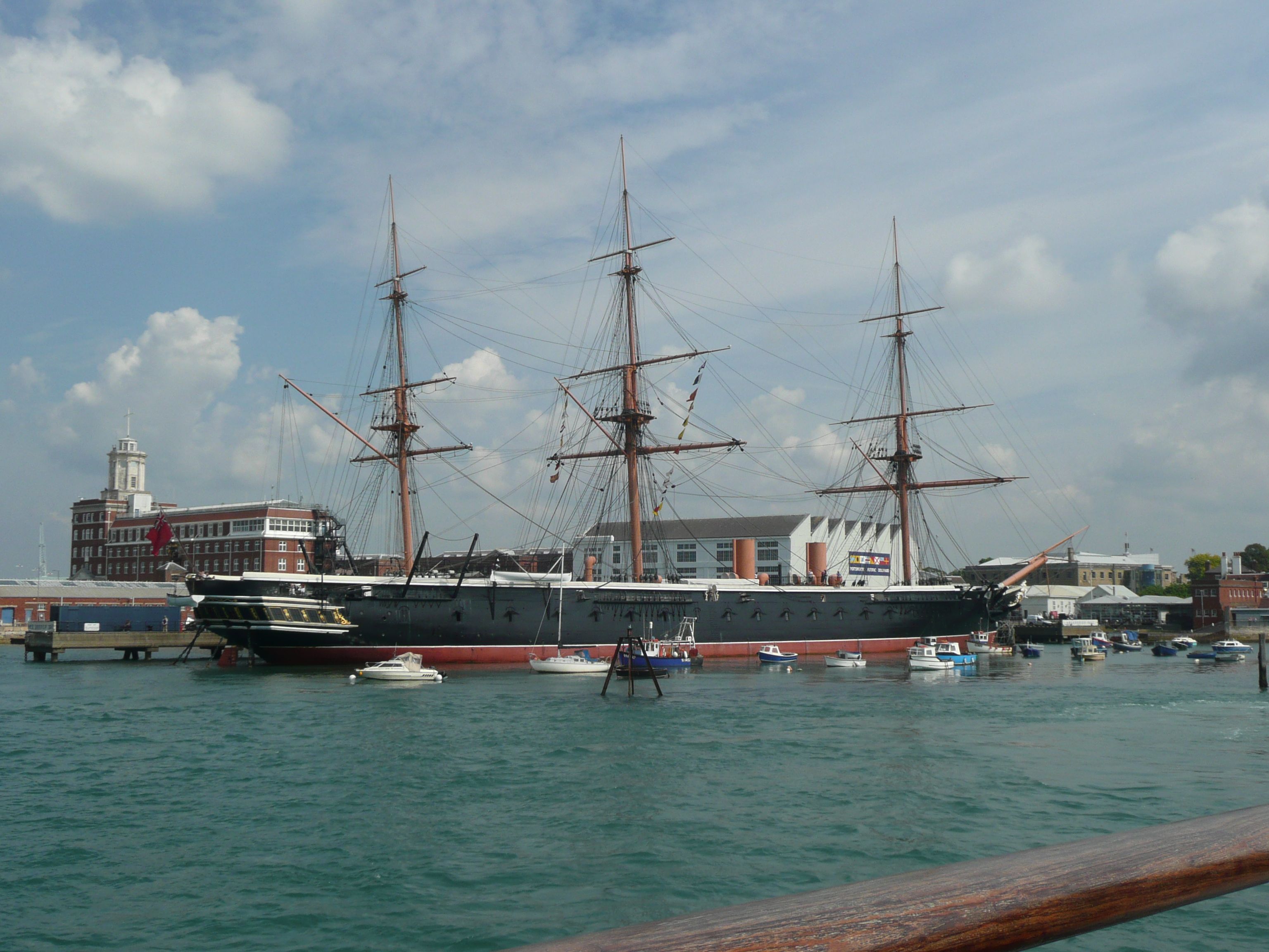 Suddenly I come to an abrupt end where the chain motif of the pavement disappears under a boundary fence of a building site. So, following directions from a passer-by I make my way towards Portsmouth Harbour railway station – where I take the ferry to Gosport, accompanied by a tail wind of shrieking seagulls. From the ferry I take a few photos of the magnificent HMS Warrior, a nineteenth century steam and sailing warship which was built to fend off the French.