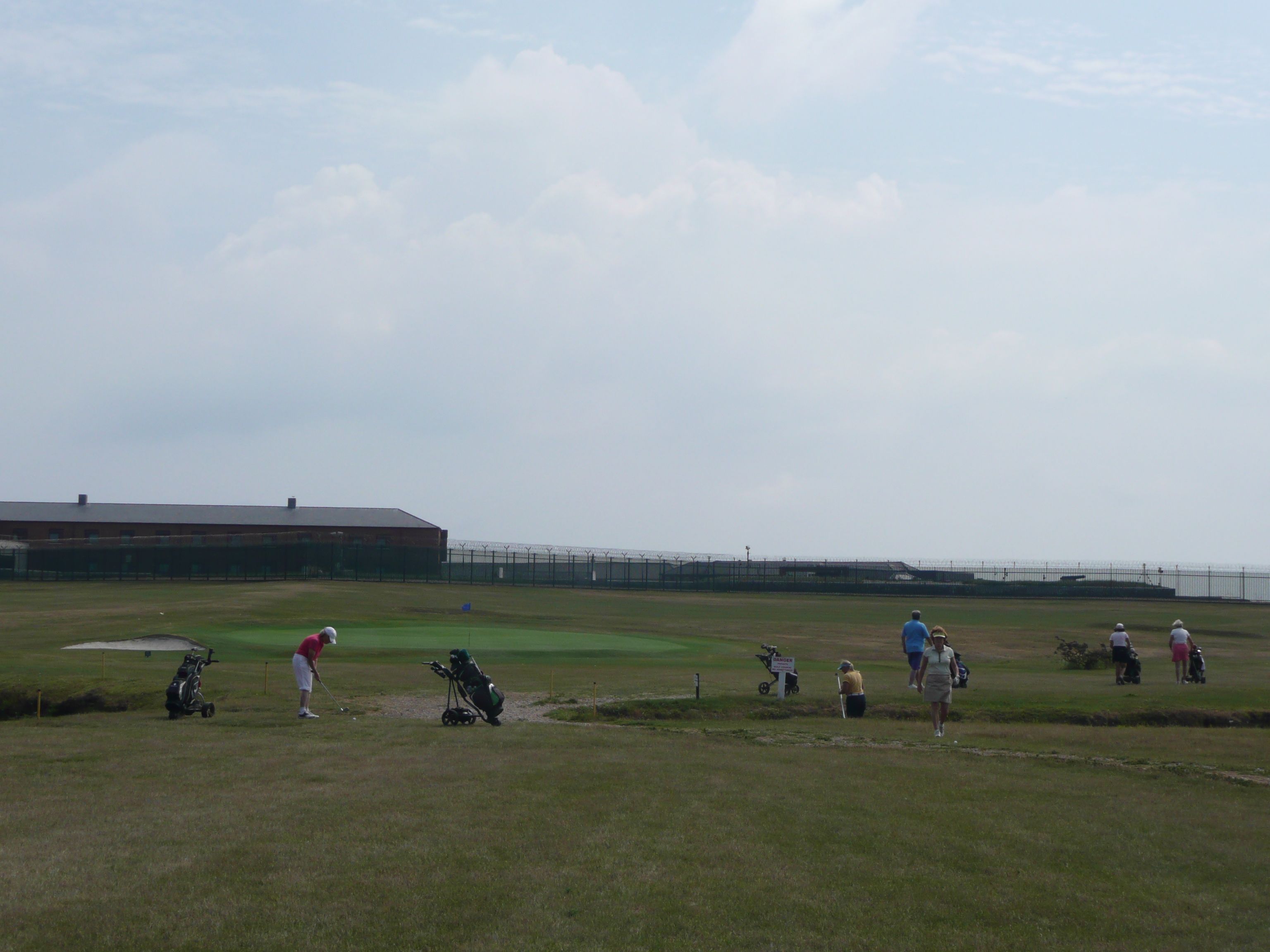 About 30 minutes later, after walking past the intimidating hulk of what I later discover is an Immigration Removal Centre, I follow a footpath back to the water. The path cuts through a golf course overlooked by the centre and I reflect upon the painful irony of the arbritrary fortunes of those in the “holding pen” and the ladies of Gosport engaged in a gentile game of golf.