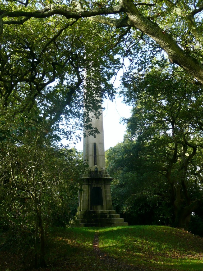 P1030664 Coming to the river we cross over a road bridge with signs warning motorists of crossing otters (how long must it take for an otter to cross a road? Answers on a postcard…….) and then turn right along the main road. Fortunately we soon spy a footpath sign off to the left which takes us up into a quiet wood. Acorns are strewn across the path and with eyes down I do not see the monument up ahead until we’re right underneath it.