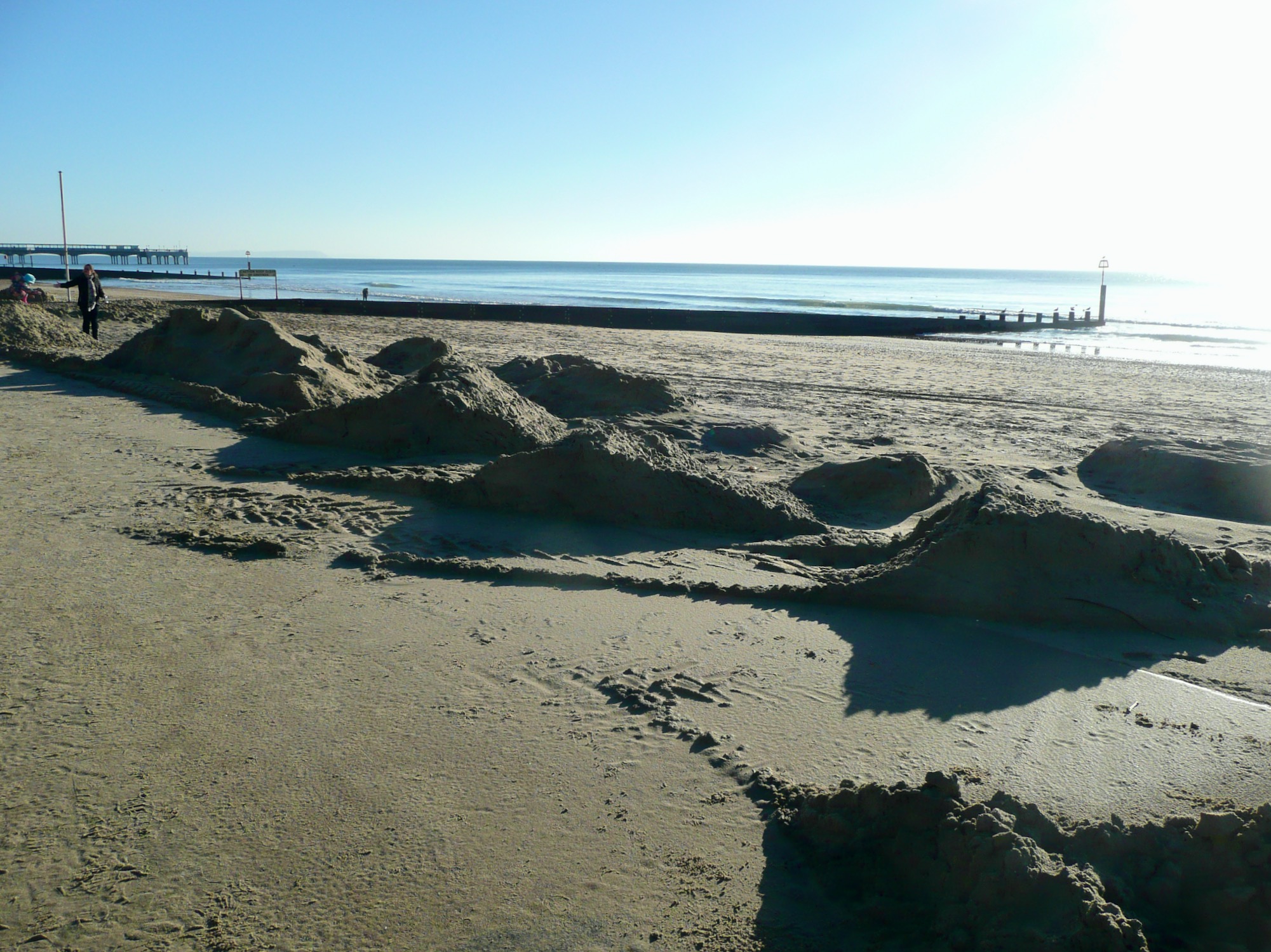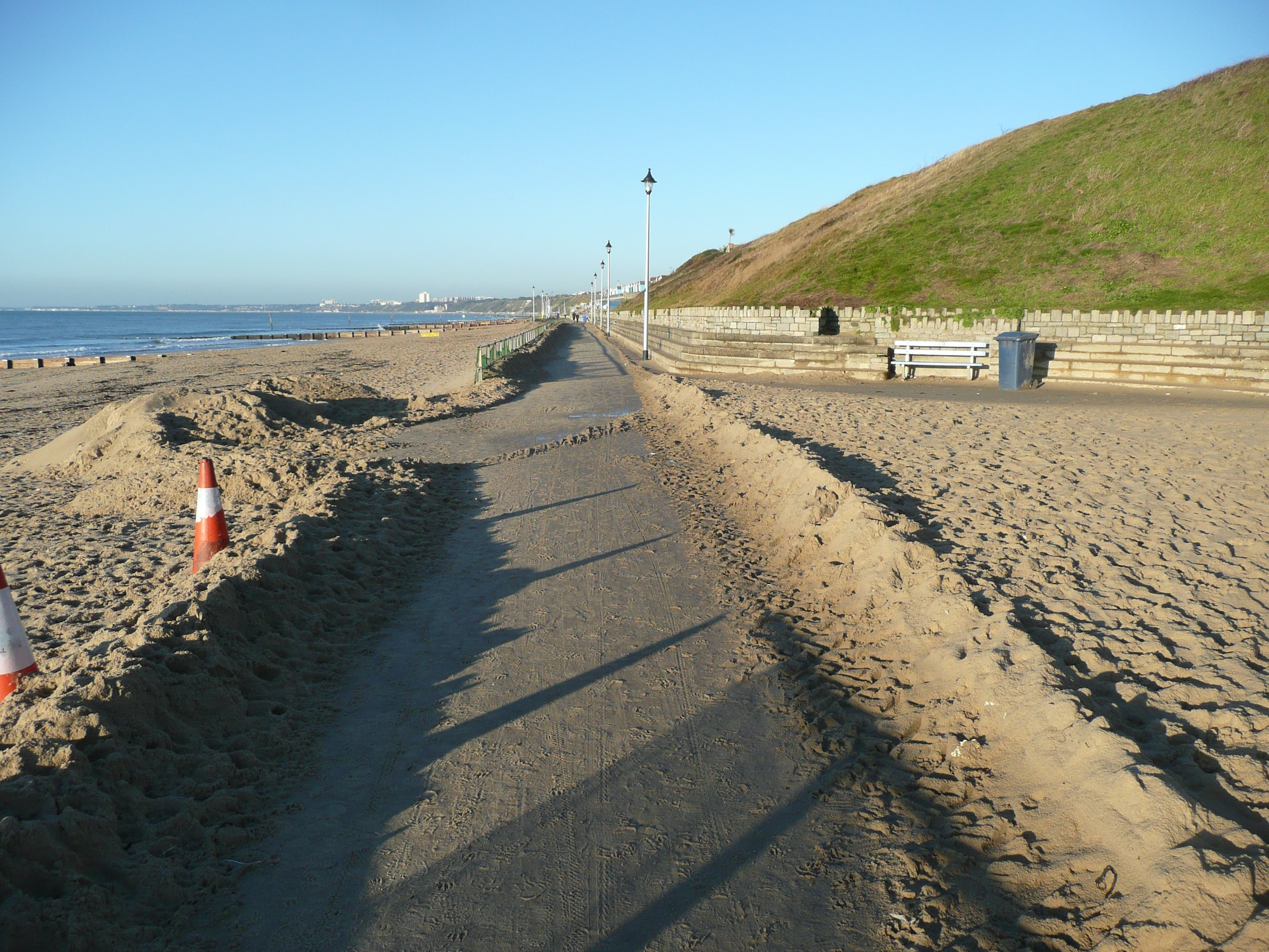 I walk on, enjoying the first nice day we’ve had since the storms and floods which hit Chichester particularly badly. Moving up from the beach onto the concrete promenade the effects of these storms can be clearly seen. Attempts have been made to clear the sand that has washed up onto the path – this was to be feature of the whole walk into Bournmouth.