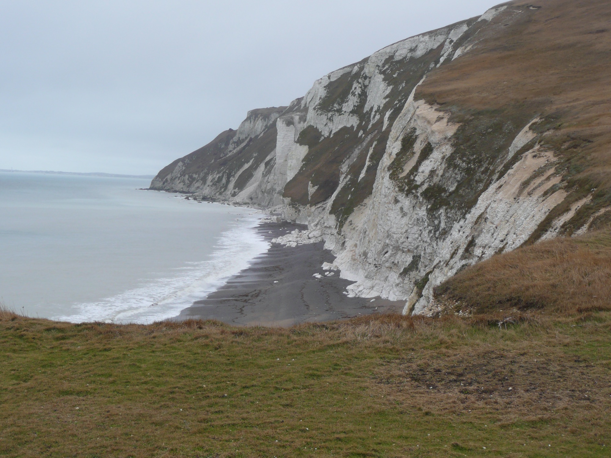 The sky is now threatening rain so I stand and dither at the base of a very steep slope wondering whether it is wise to carry on, or leave the rest til tomorrow. If I continue I will have to come back along the ridge which would involve another three miles of extra walking in the wrong direction but it is still quite early to stop. I decide to be brave and soon I am quite alone, puffing and panting up Swyre Head, the steepest of the three “bumps” I will have to climb today. The path is muddy and slippery and runs parallel to another narrower one, closer to the cliff edge – I think this must be the original one but due to slippage people are keeping well away – big piles of chalky rock have crumbled down onto the shore.