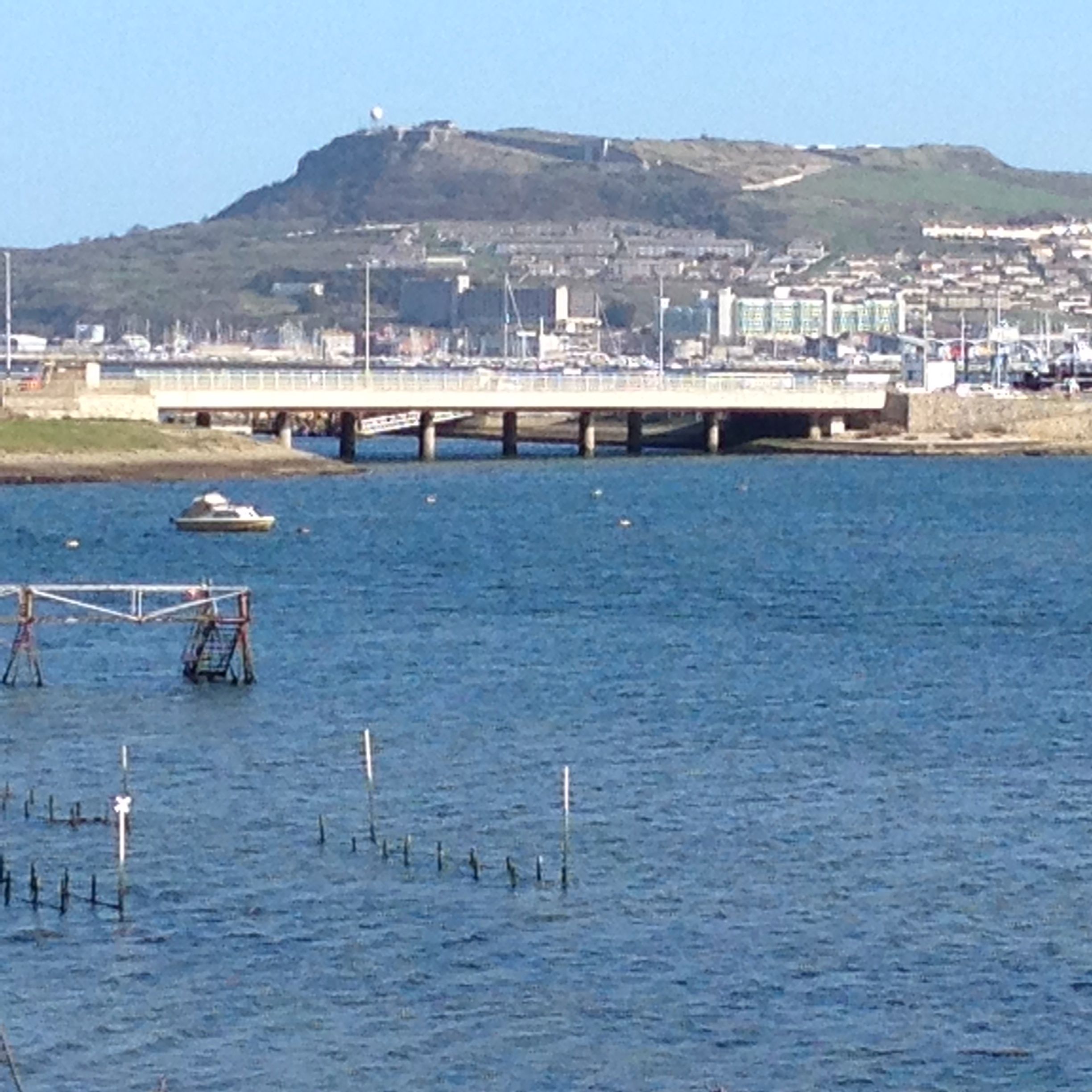 The acorn symbol of the South West Coastal Path is clearly signposted but at one point I am diverted inland to skirt an industrial complex. I walk through residential streets for a while before coming back to the path that leads to Portland Harbour – a deep water harbour formed by the building of a breakwater in the mid 19th century. Six million tons of Portland stone were needed to build the defence wall, quarried by convicts otherwise bound for the colonies. I reach the road bridge that connects the island with the main land and take a picture.
