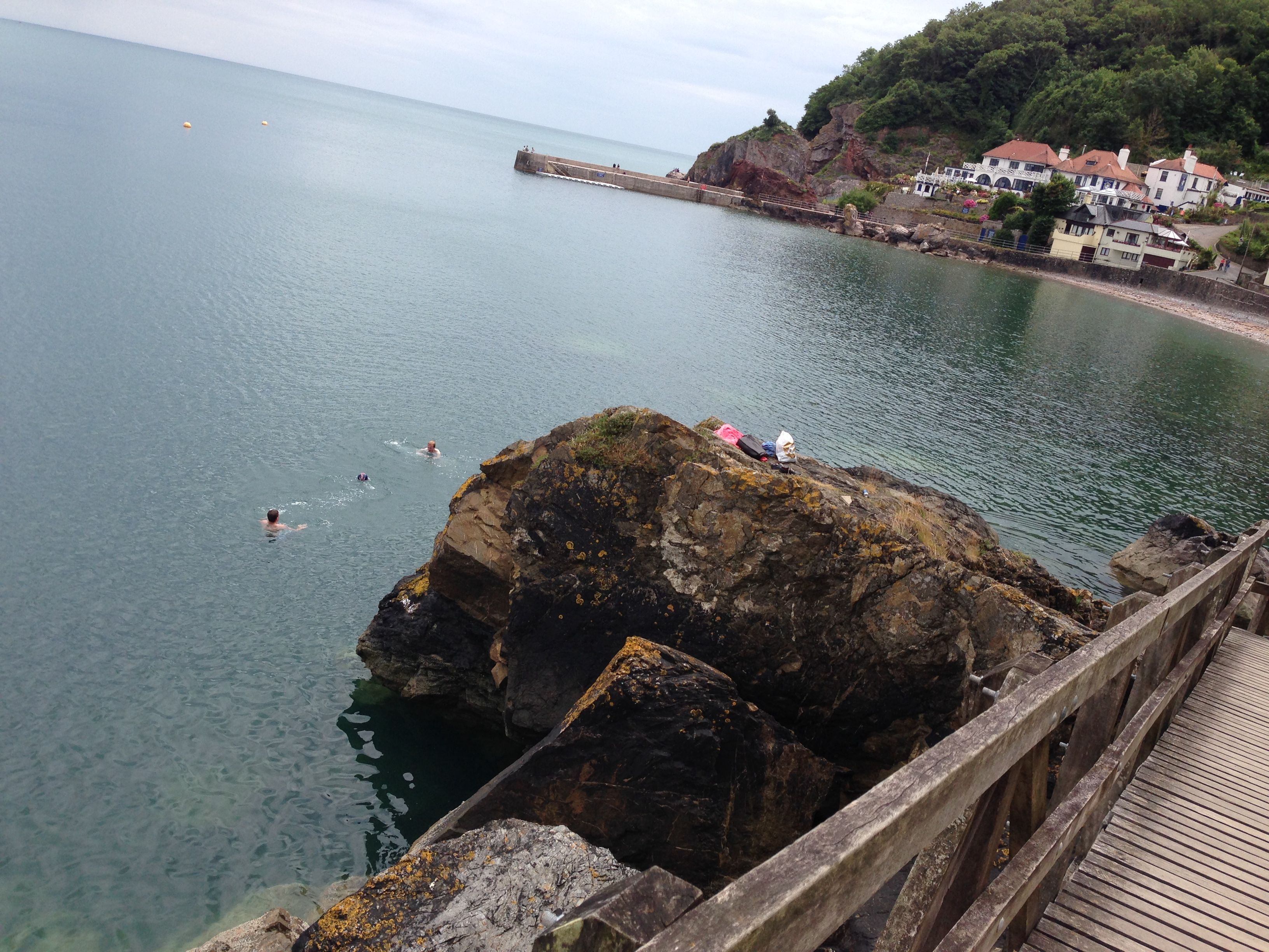 Moving south I walk on the concrete path, over a large rock on a wooden walkway where some boys are swimming and on to the village of Babbacombe.