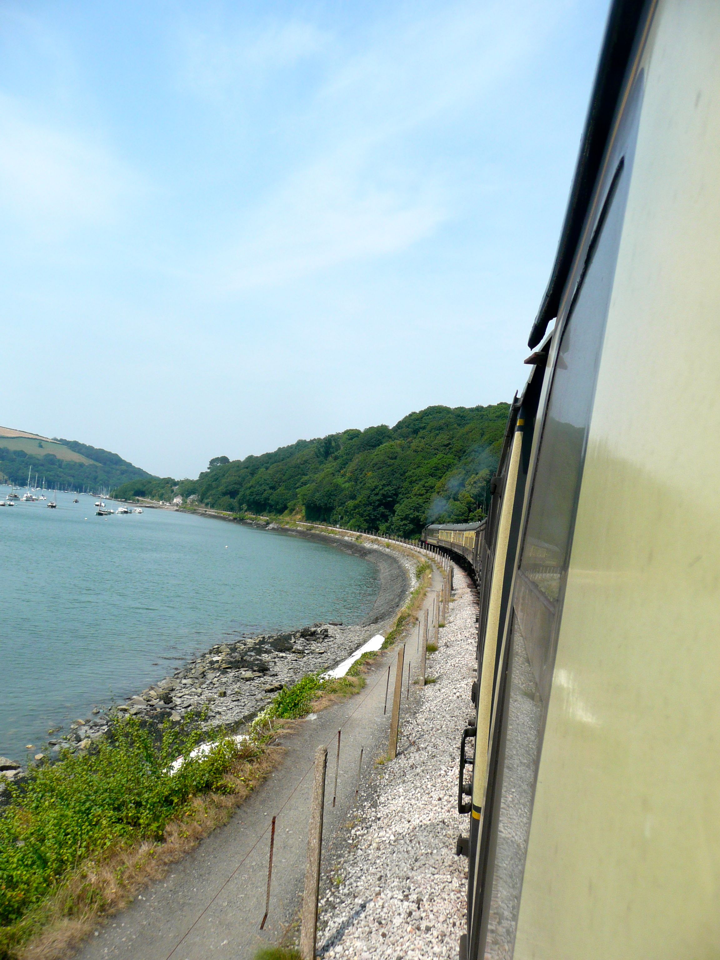 Moving on from scatological studies I follow the lane inland and end up on a very narrow road leading down to Stoke Fleming. Just up from the village shop I can get a bus back to Dartmouth. I have twenty minutes to wait which I spend thinking about how to get back to Torquay – steam train? ferry? bus? As it happens I go for all three. I catch the tugboat ferry to Kingswear and arrive just in time for the steam train to Paignton. The train is hot and crowded and the wool upholstery is unbearable. I get up and stand by the door trying for a photo but it’s difficult to lean out far enough to get a good photo.