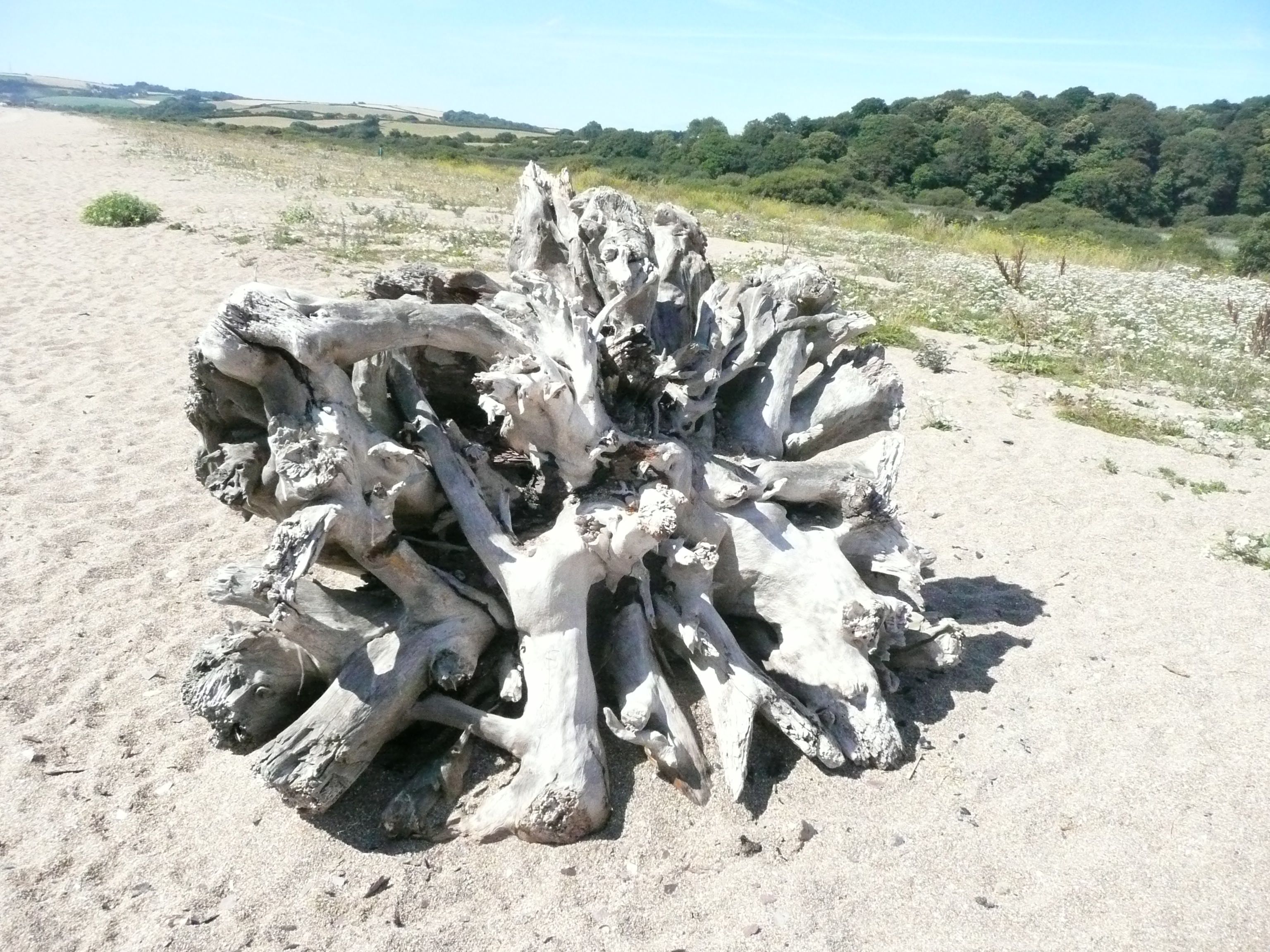 This is Slapton Sands and I am not so enamoured when I realise it is actually very fine shingle. After five minutes of trudging I stop for a drink next to a striking piece of driftwood.