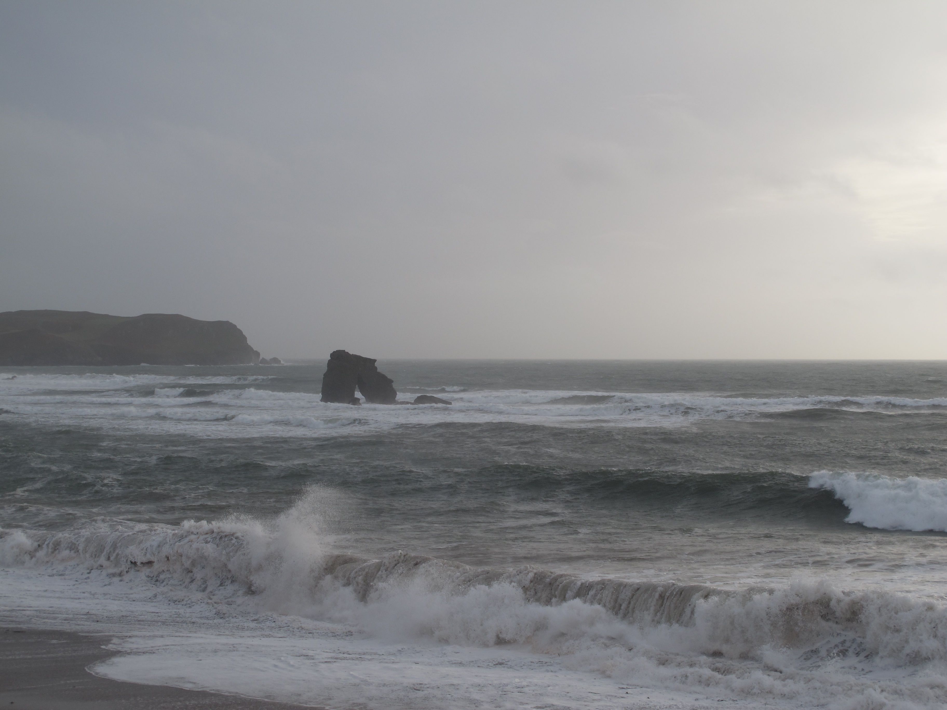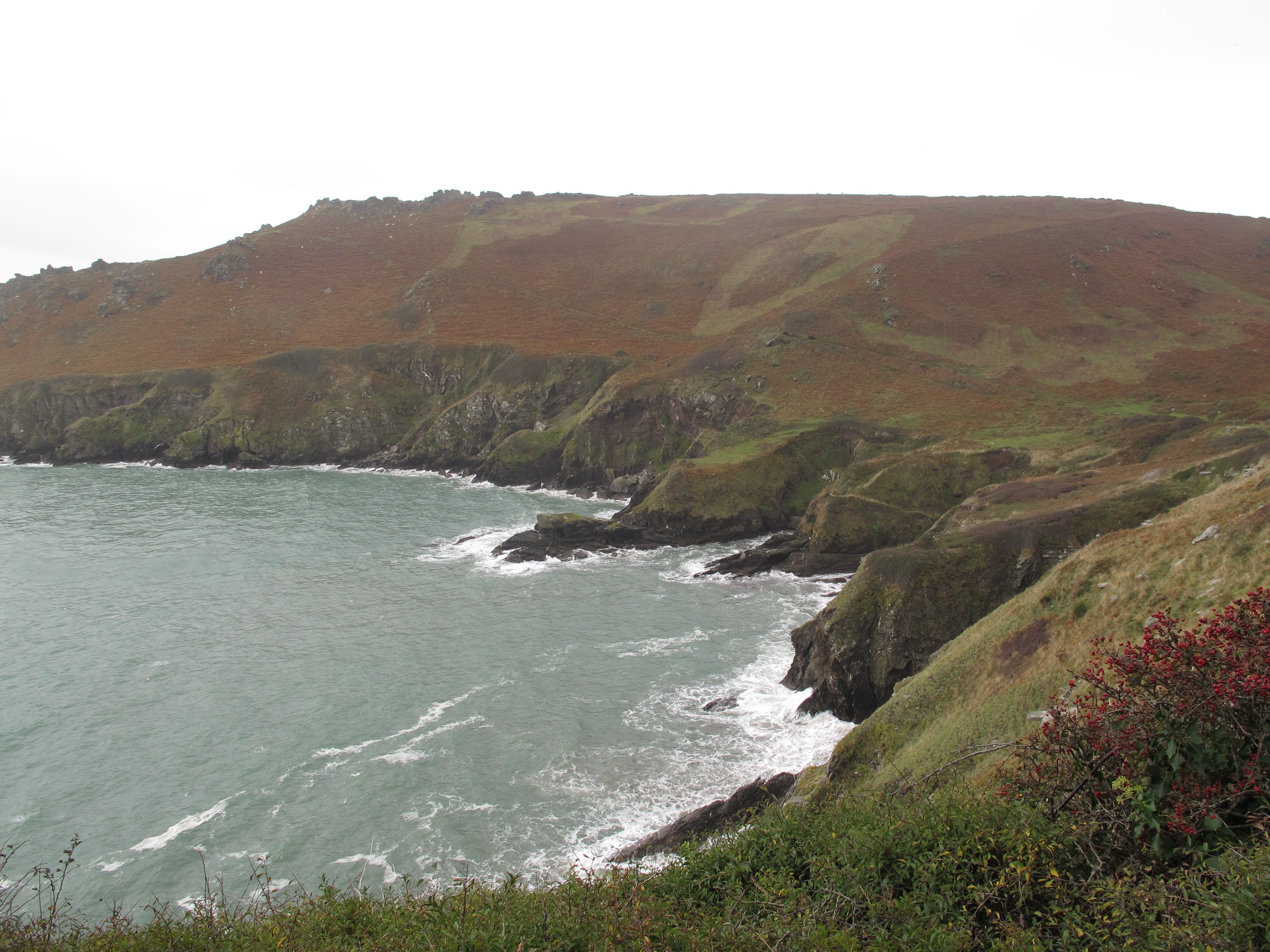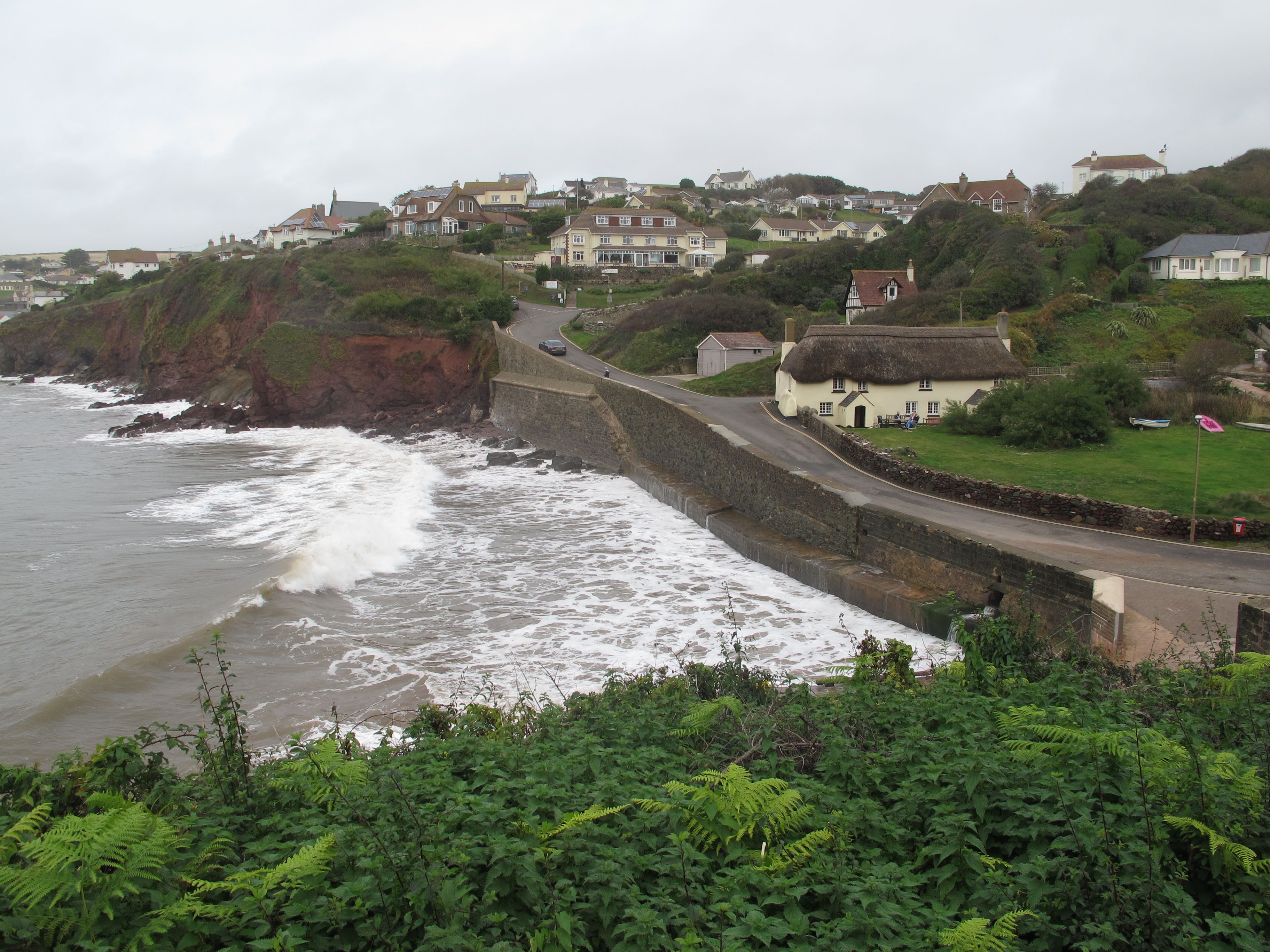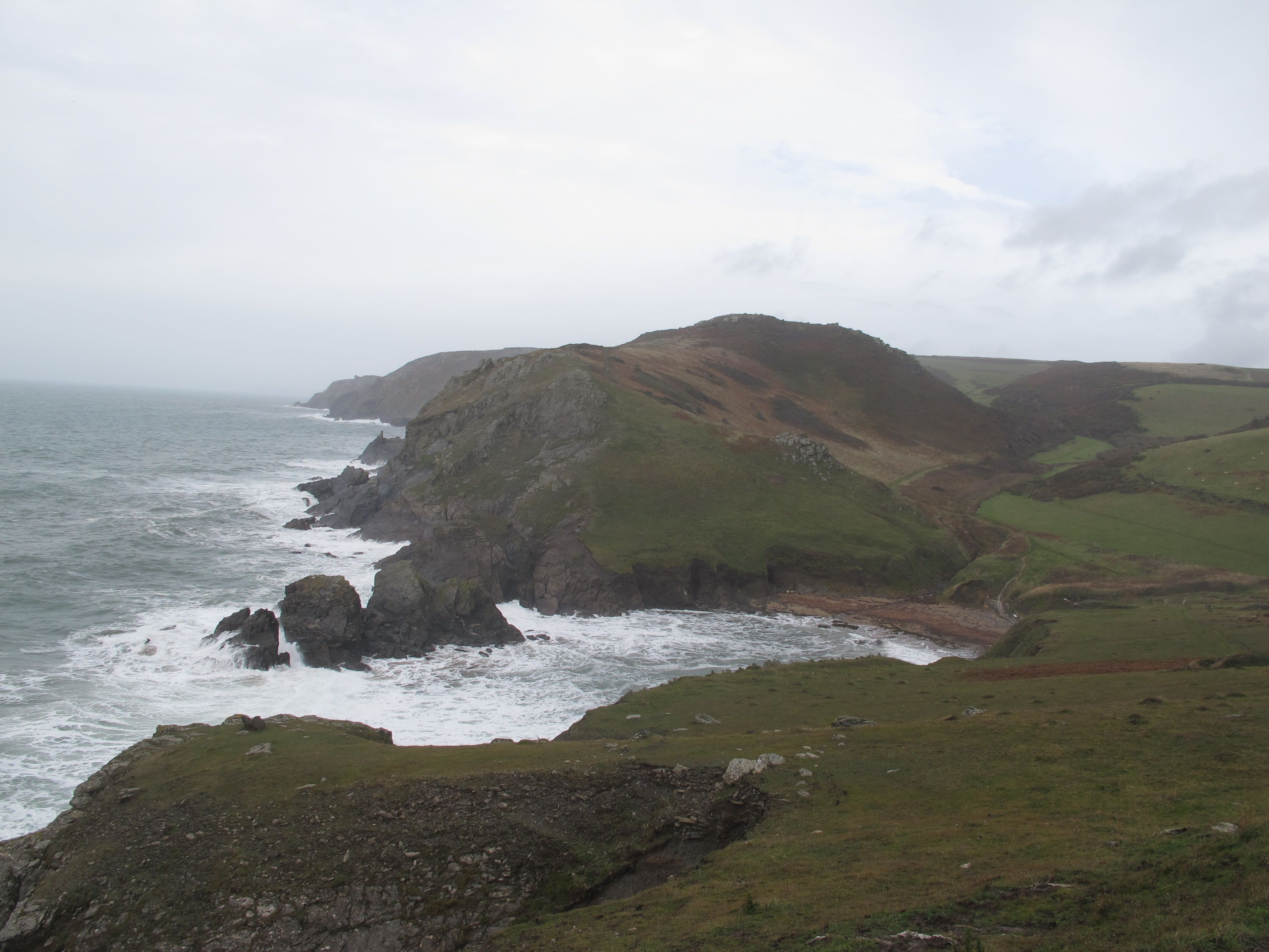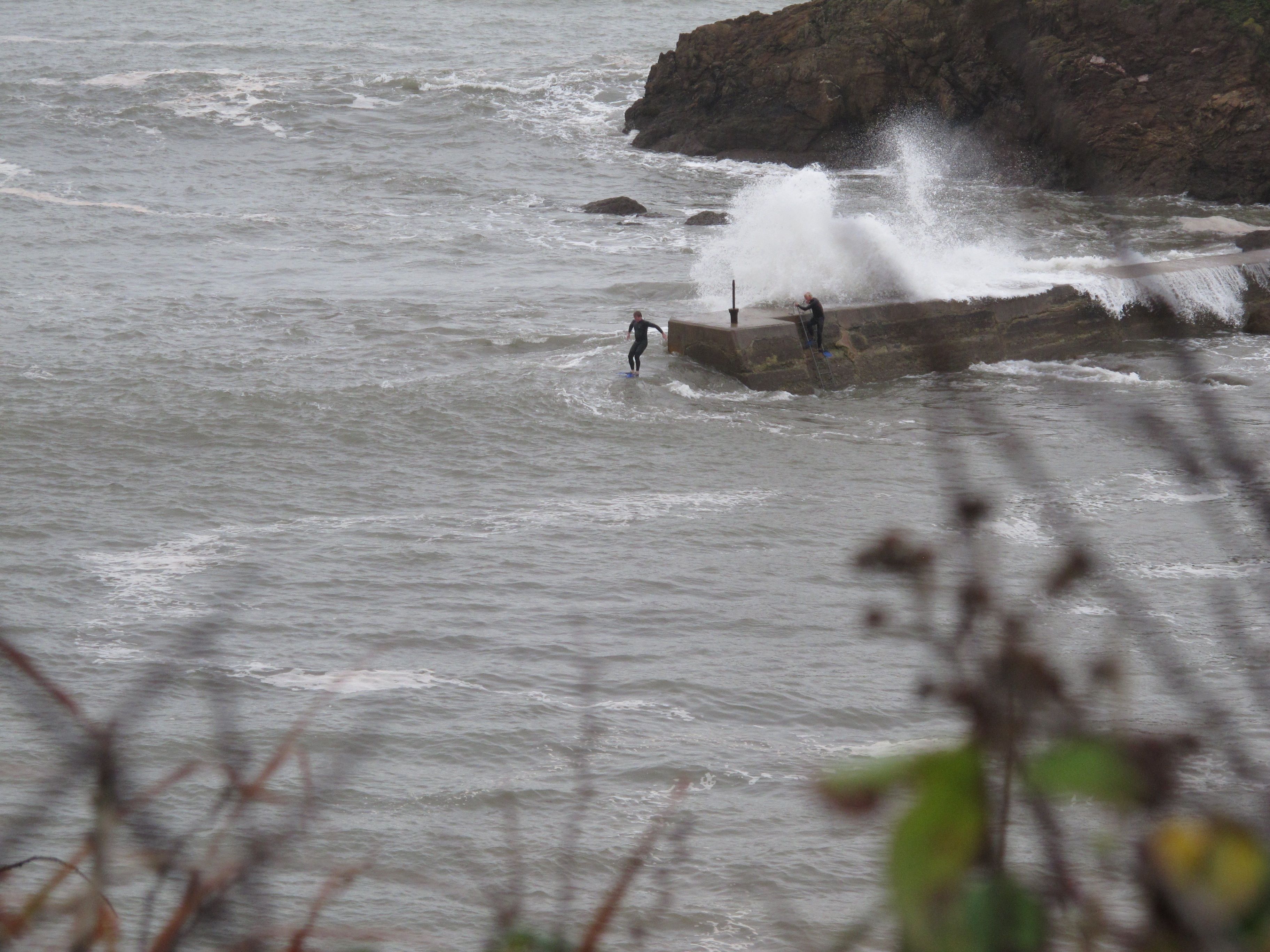 Walking over the bridge we stop to watch some surfers and then further on, in Outer Hope, some people in wetsuits standing right at the very end of a long breakwater. As we watch, massive waves crash up and over the wall – these matchstick men look extremely vulnerable but I guess they know what they’re doing.