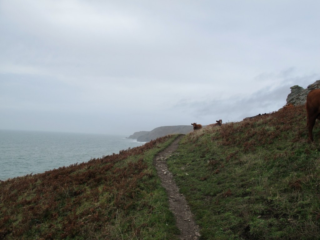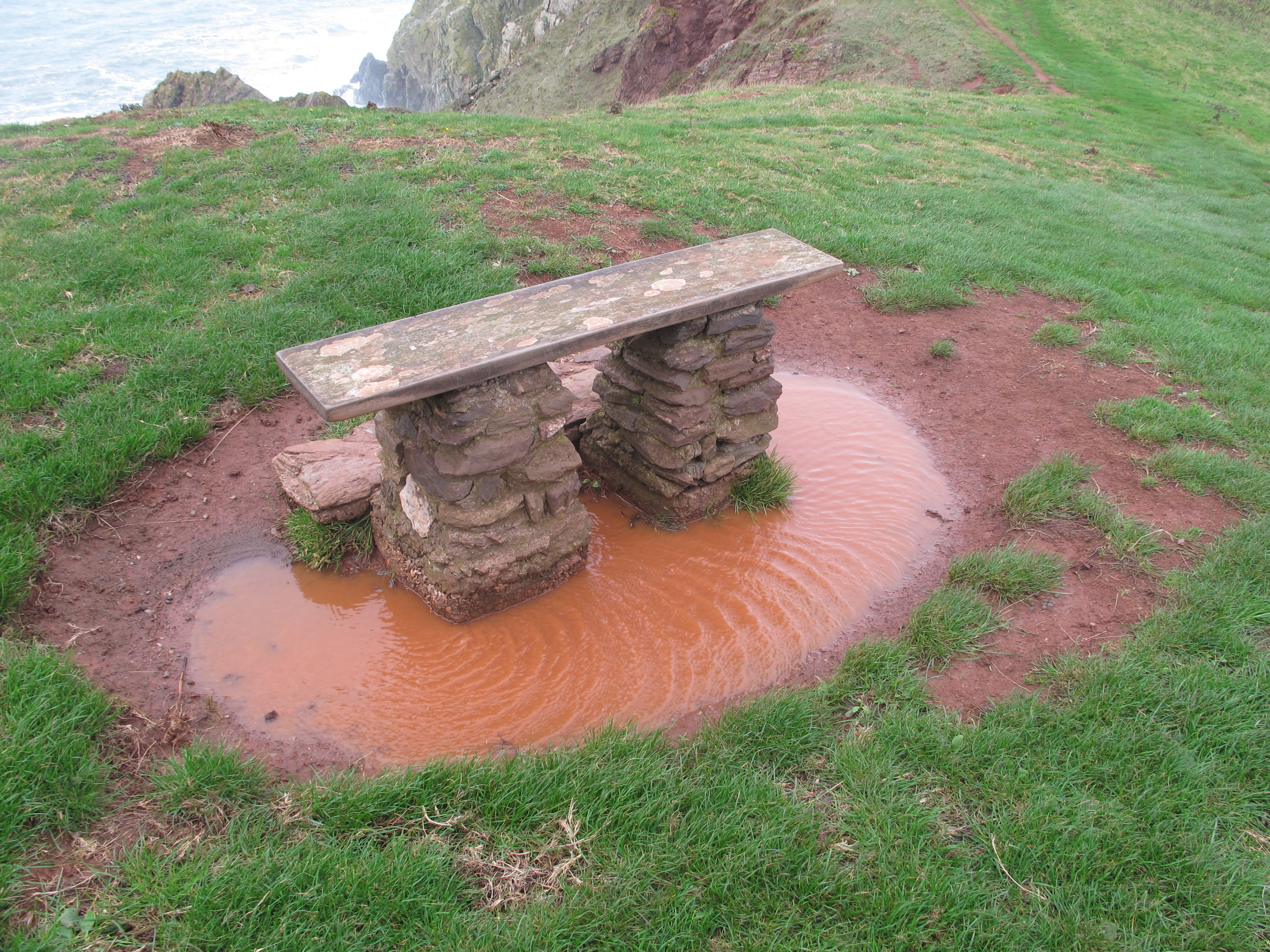 Back by the beach again the path rises steeply upwards and we are then back onto the top of the cliffs heading for Bolt Tail. On a downward slope we pass a bench with its own moat – a testament to the amount of rain we could have encountered, we have been lucky.
