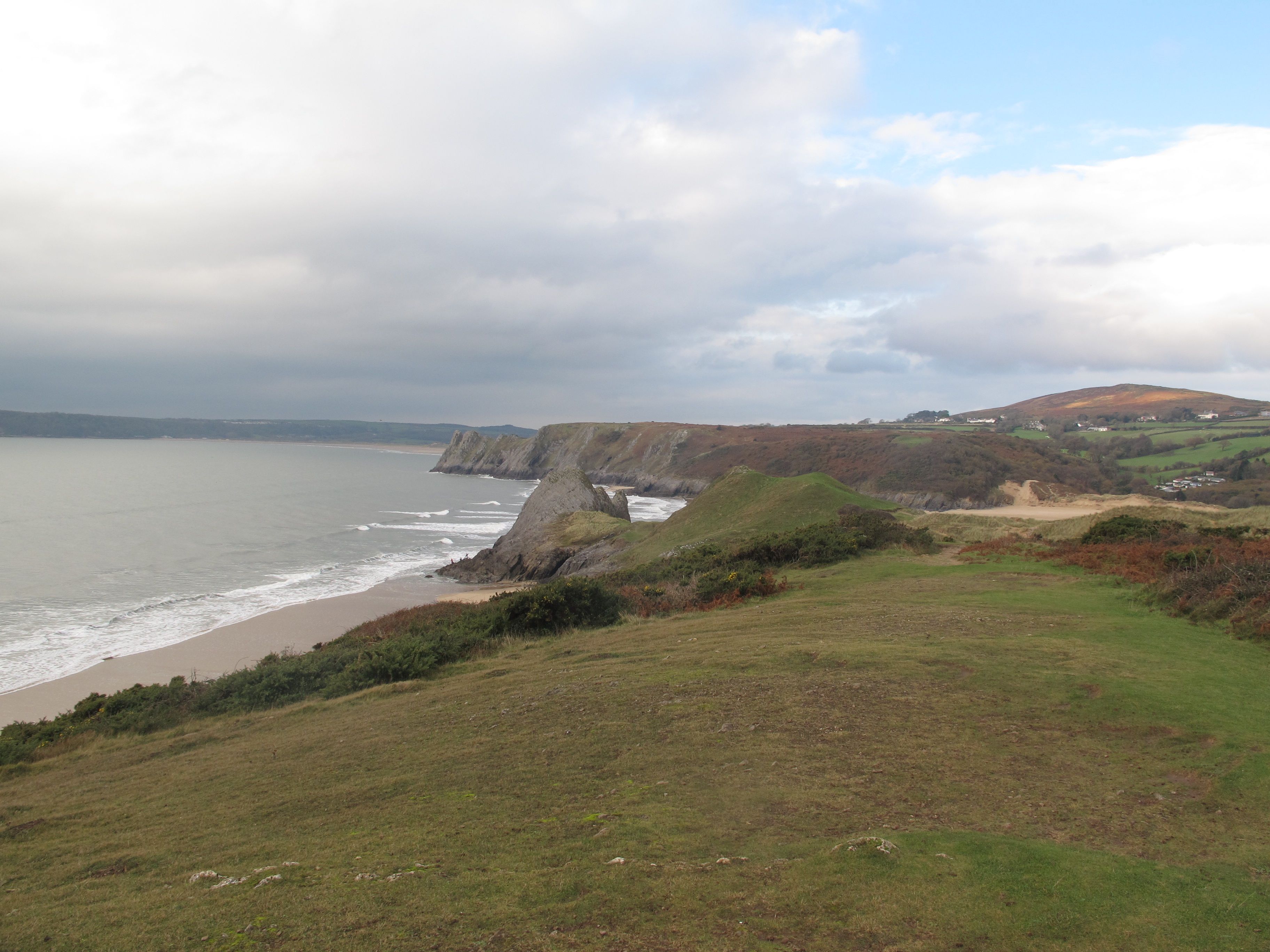 So, after a complicated taxi arrangement, we are deposited at Fox Hole, which looks nothing like the ones in our embankment, and set off westwards, heading for the pinnacle guarding the entrance to Threecliff Bay. It’s a dull day with promising patches of blue sky – “enough to make a sailor suit” – as my mother used to say.