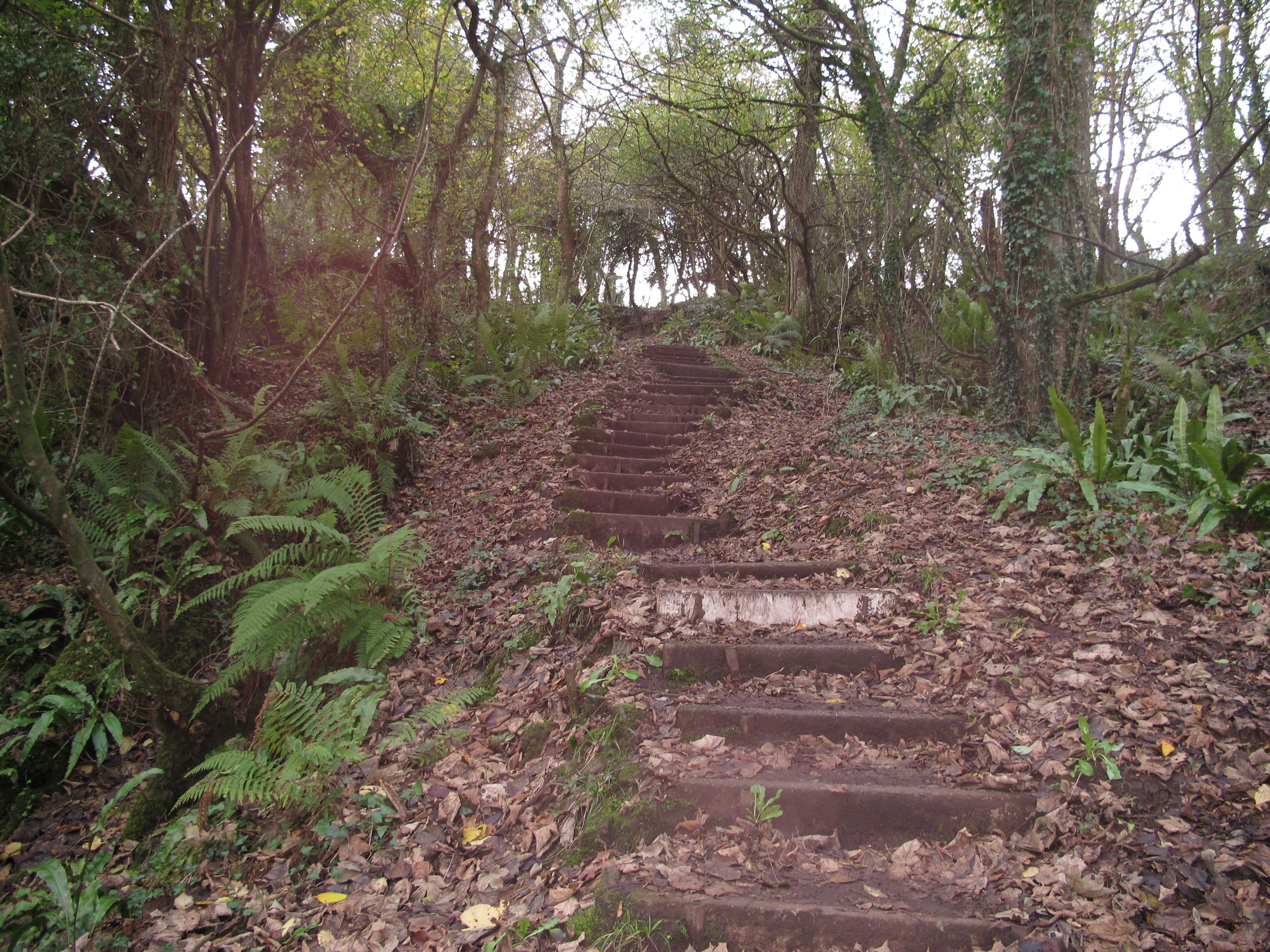 From here the path winds up through woods and out over the cliff tops, down to the sea – we meet no-one.
