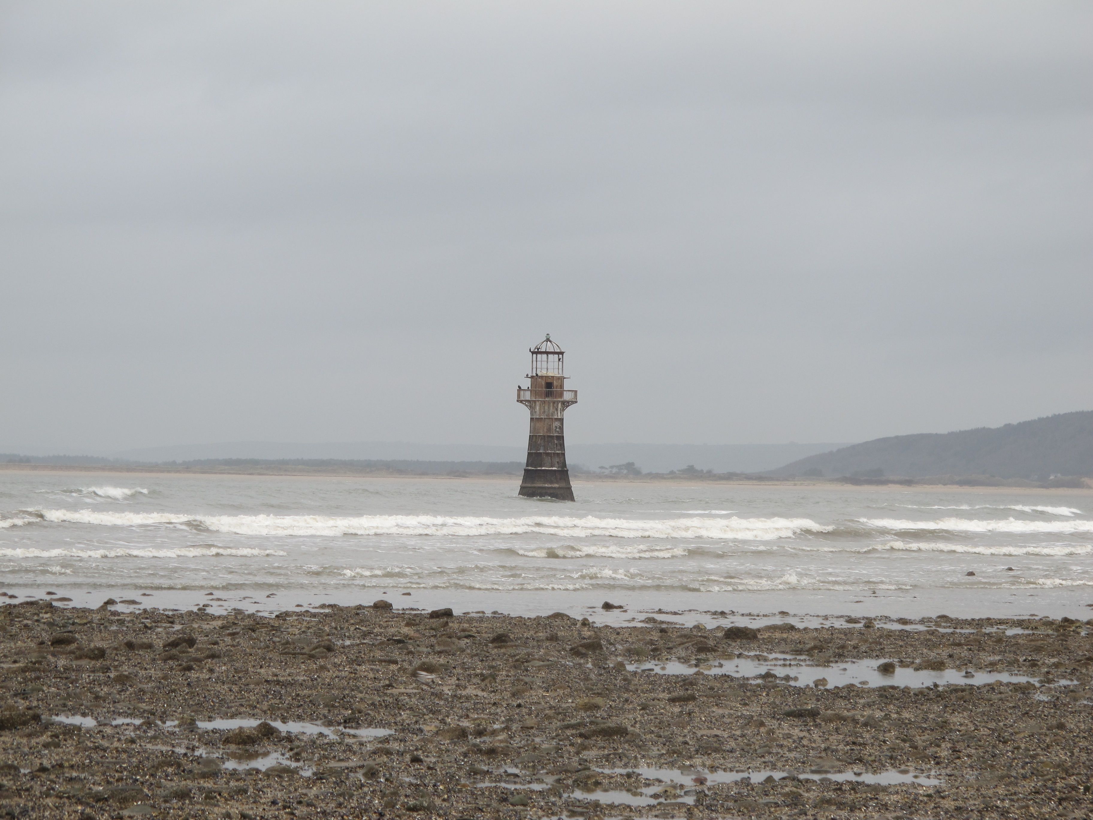 Dropping out of the dunes onto the beach we are faced with a vast expanse of sand and some encouraging signage…IMG_2039Undaunted we trudge off across the sand, crunching through thick layers of sea shells – there are some beautiful razor clam shells but the photographs do not do them justice – more to learn.IMG_2044This is Broughton Bay, a long sandy plain, flanked by high dunes on the right which make it difficult to know where you are. We do however have a helpful landmark and that is Whiteford lighthouse, which can be reached when the tide is out – we can see it in the distance.IMG_2045Built in 1865, this is the only wave-swept cast iron tower of this size in the UK – there are only two in the world, this one and another in Barbados! Discontinued in 1926 the tower had space for a keeper or two in a room at the top and some sources say the rota was  three weeks here and three in the lighthouse at Llanelli. The romantic in me thinks how lovely it would be to go to sleep to the sound of the waves but I’m sure the reality was quite different.