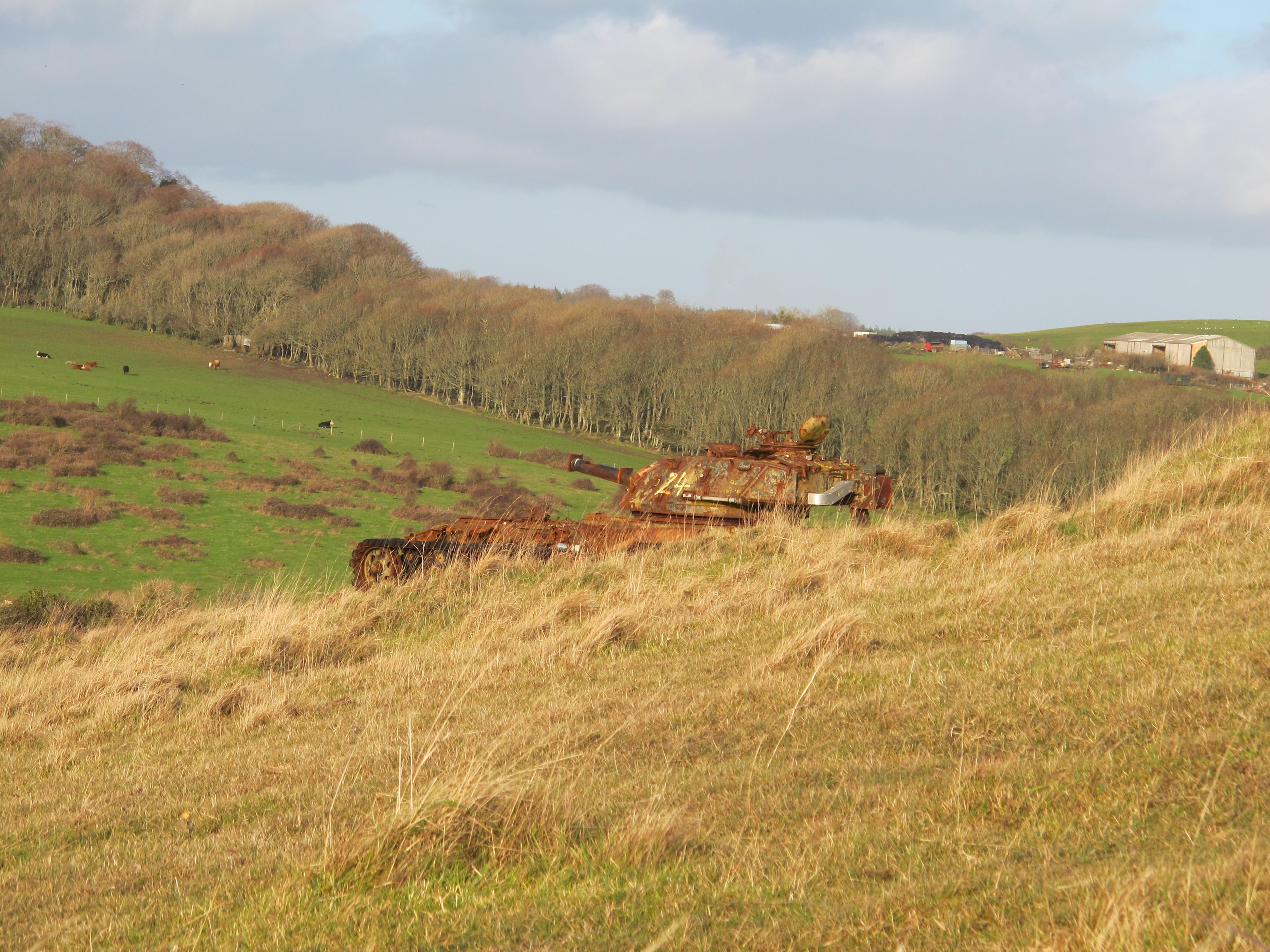 IMG_2062I took a shine to the metal hen………IMG_2065In the barn we read that this was where the children would put on plays for the grown ups – I have a Dr. Doolittle moment……IMG_6012_2Back to the coast again we walk along the top of the cliffs in the sunshine – to our right a rusting shell of a tank peers menacingly in our direction.IMG_2073Down below the grand sweep of Worborrow Bay……. IMG_2067  ………and ahead a sprinkling of small rocks break the surface of the scalloped edged seersucker sea.IMG_2079