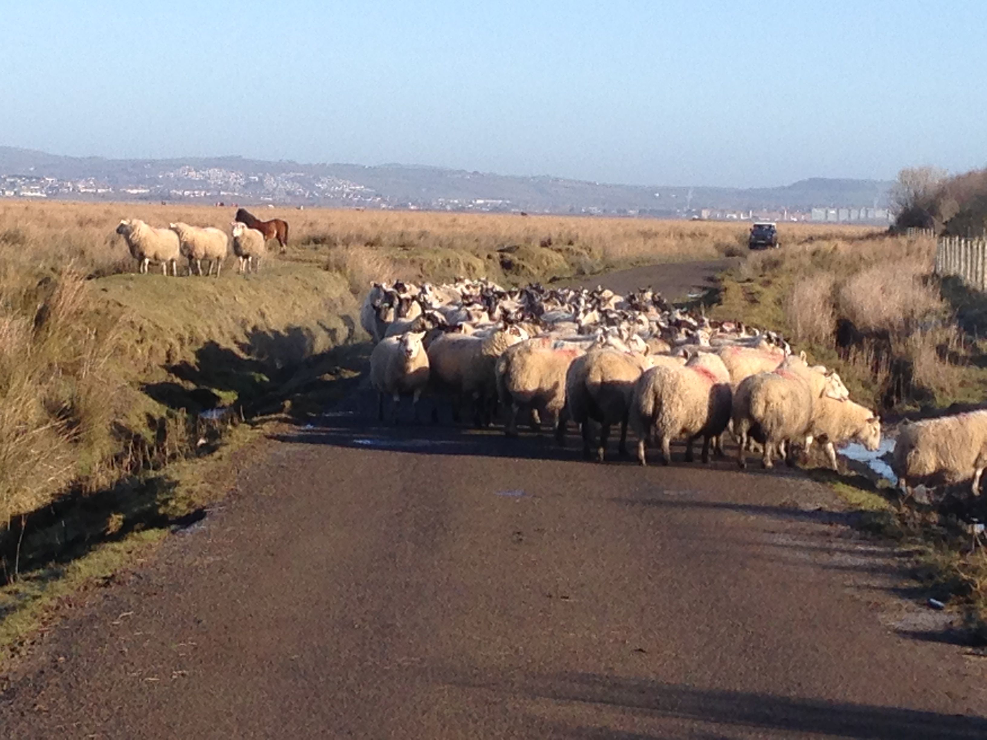 I am dropped at the church where Damian and I finished last time and head down the “Marsh Road” which skirts Llanrhidian Marshes. The sky is blue, it’s a beautiful morning and my first encounter is with a flock of bewildered sheep caught between the farmer in his Landrover driving them forwards and me striding purposefully down the road towards them.