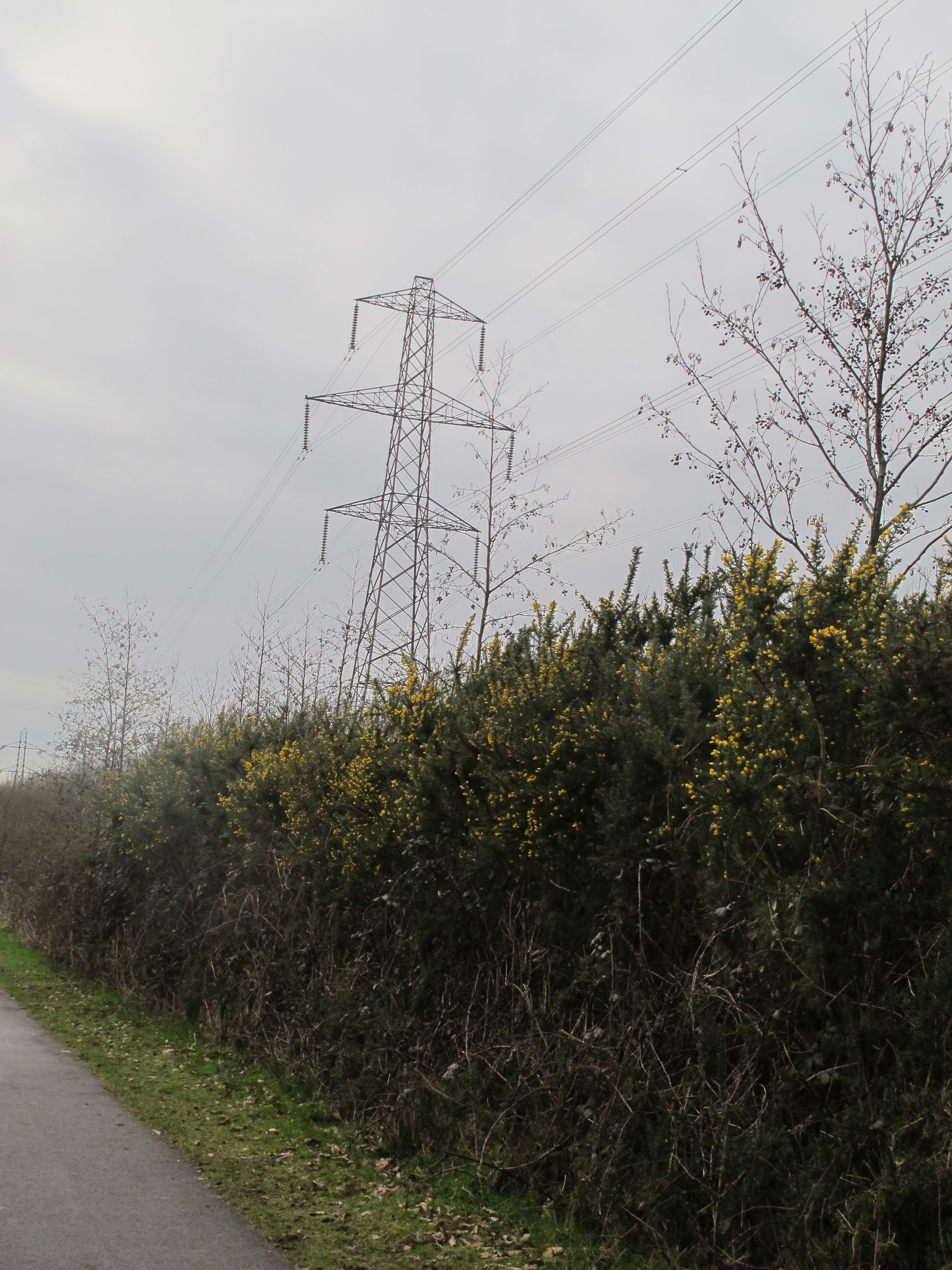 The path itself is overlooked by a line of towering electricity pylons and I find myself thinking of a book called The Pleasures and Sorrows of Work by Alain de Botton in which, after encounters with enthusiasts working in the industry, he writes about electricity pylons: “In different species, I noted varieties of modesty or arrogance, honesty or shiftiness, and in one 150-kilovolt type in ubiquitous use in southern Finland I even detected a coquettish sexuality in the way the central mast held out a delicate hand to its conductor wire”
