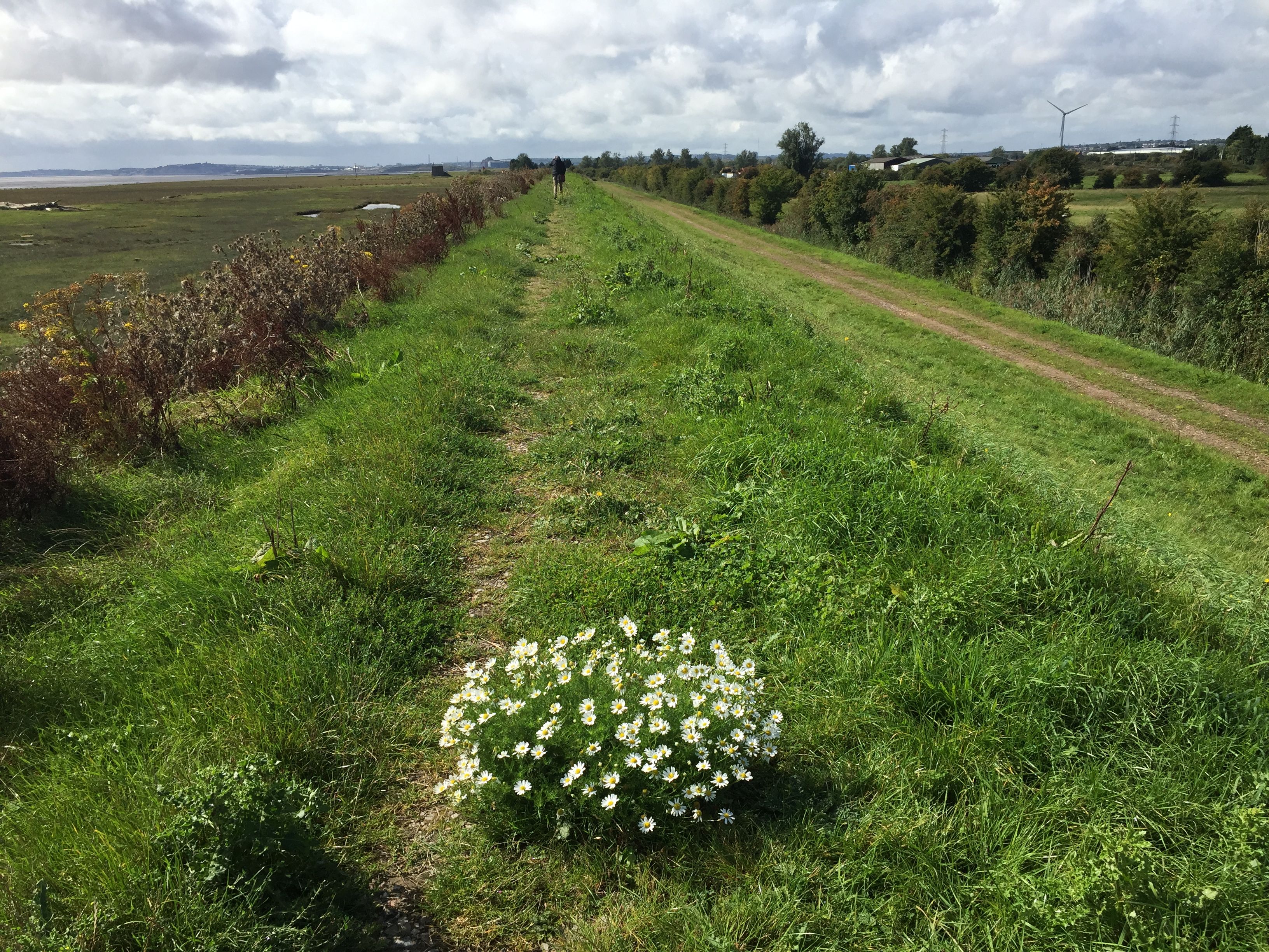 We follow the path around the edge of a few fields, over a newly constructed bridge and then back onto the sea bank.