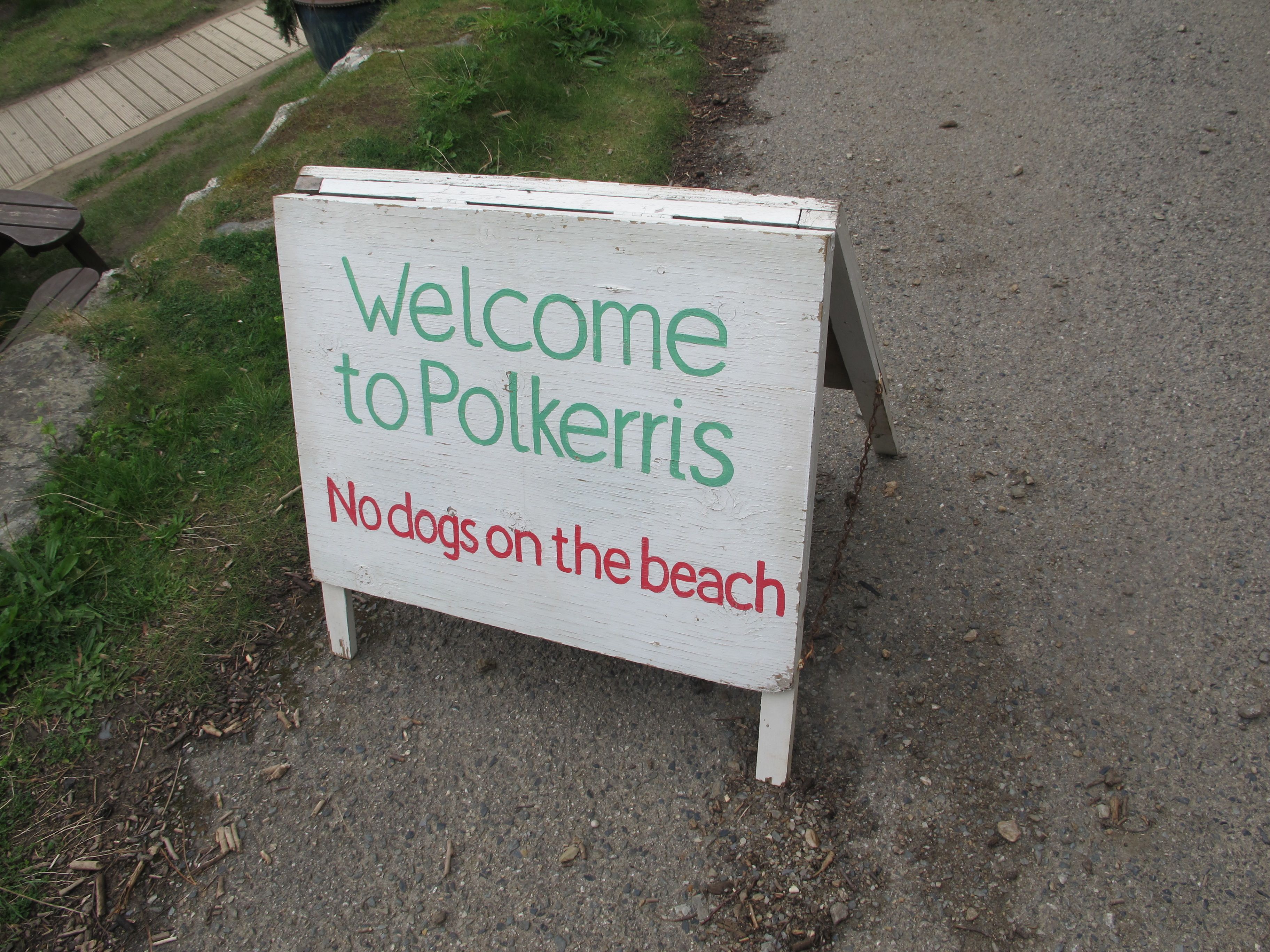 A few stepping stones keep the hoi polloi off the neatly trimmed grass………IMG_2490Up on a hill above the cove is a cheery red and white striped tower, a crowd is gathered around the information board and I don’t want to wait but I later find out that it was used for day navigation to distinguish Gribben Head from Dodman Point, a little further down the coast. IMG_2496From now on the path leads me along the top of the cliffs, one kissing gate after another (and no-one to kiss!) through fields and eventually a lovely stretch of woodland. A stone wall catches my eye – I haven’t seen that many where flat stones are placed vertically.IMG_2497……….and then down to the beach at Polkerris which gives me a better welcome than the dogs.  I have made good time and it’s a respectable hour to sit down with a pint.