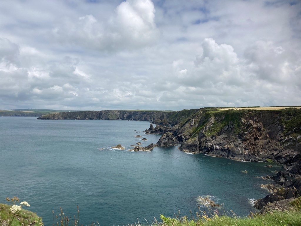 We walk on, round a promontory – yet another Castell Coch (there are so many of these in Wales) – “coch” means red but there’s nothing red around here. Later the path takes us through a series of “pwlls” – small inlets ringed with steep cliffs and inaccessible beaches – or so we think.