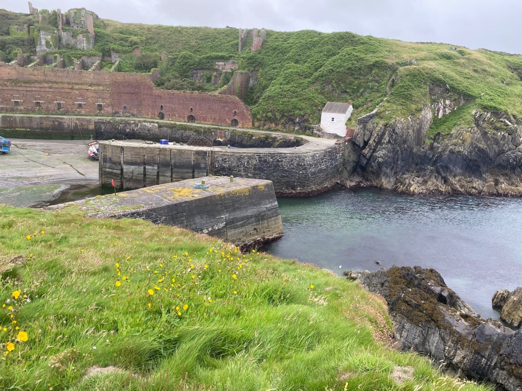 Above Porthgain are two navigation markers, the furthest away is a bit worse for weather but the one closest to us has definitely had a facelift. These would have marked the entrance to what once was a busy industrial harbour exporting slate from local quarries. The slate was cut into slabs by water powered mills and the waste was used to make bricks and road stone. Large brick “hoppers” dominate the harbour – these hoppers were used to store crushed road stone before shipment and are now a Scheduled Ancient Monument. I remember the first time I visited Porthgain almost twelve years ago that I thought these ruins may have been a prison which cast a shadow over my fish and chips. Now I know better.