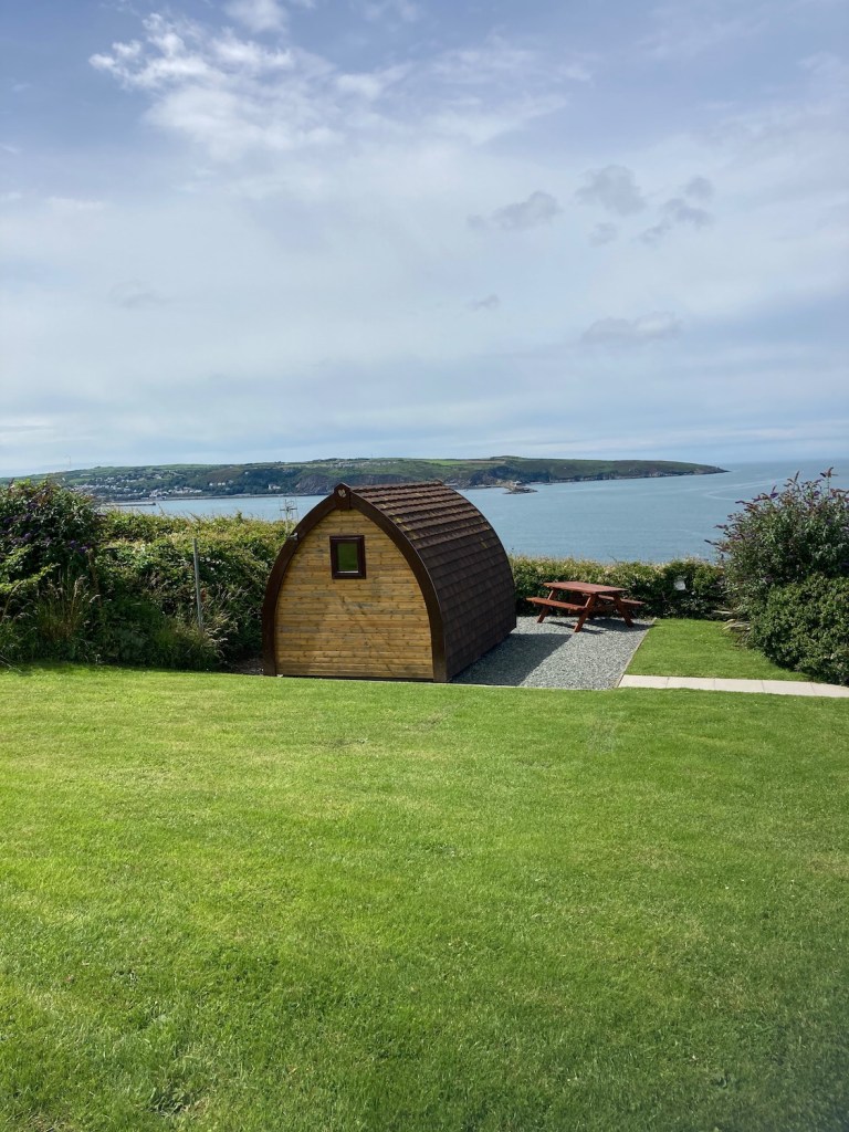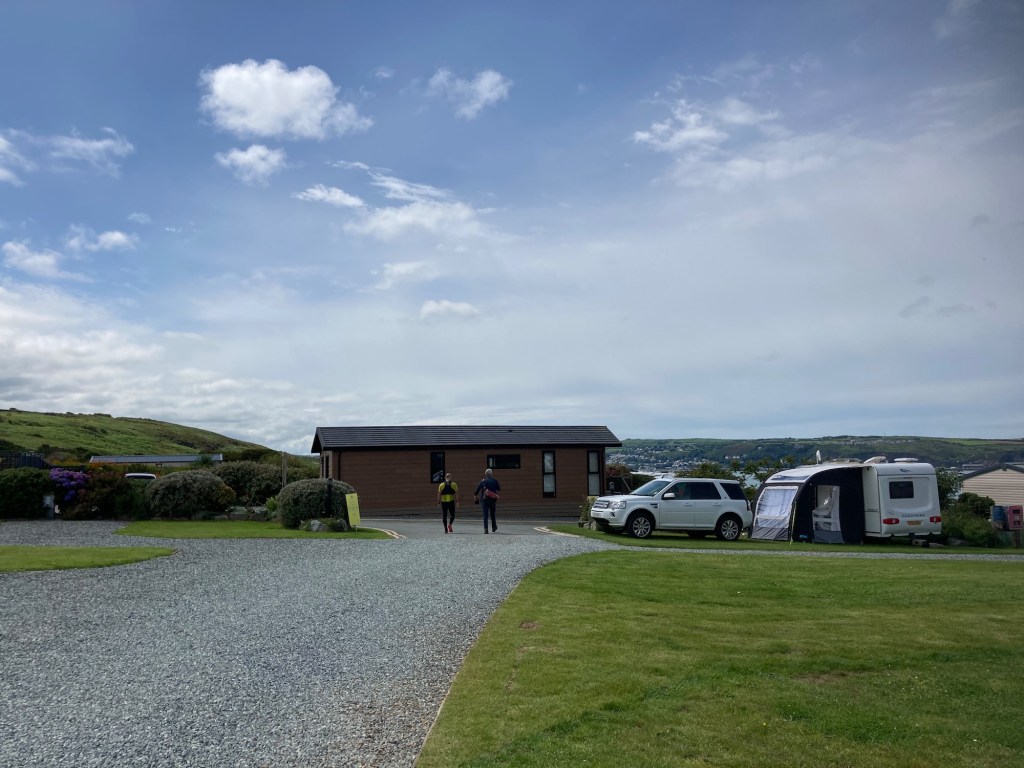 This is Damian and the SON walking through a camping site a couple of miles outside Fishguard. Apart from the usual caravans and tents, the site also offers stays in these lovely chalets with a wonderful view out to sea.