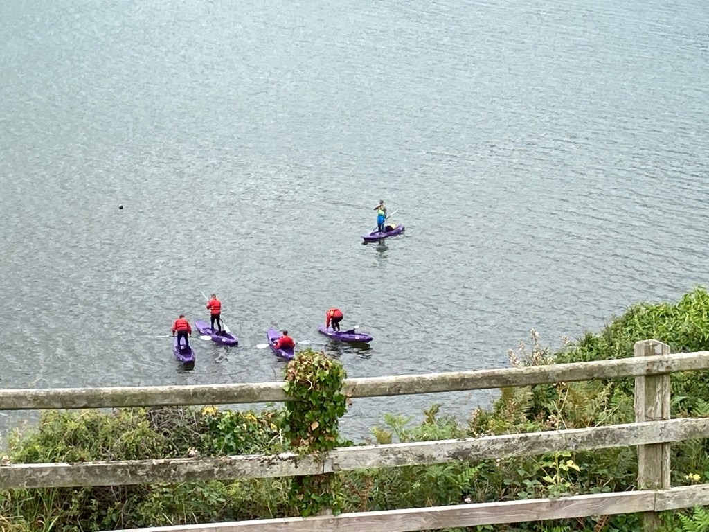 Soon Fishguard comes into view so we stop a while and watch a group of boys learning how to paddle a canoe. The trainer is encouraging them to stand up on their canoes and then sit down again without losing their balance. Most of them manage with a bit of wobbling but there is one boy who flatly refuses to do it.