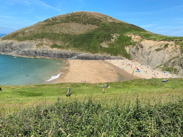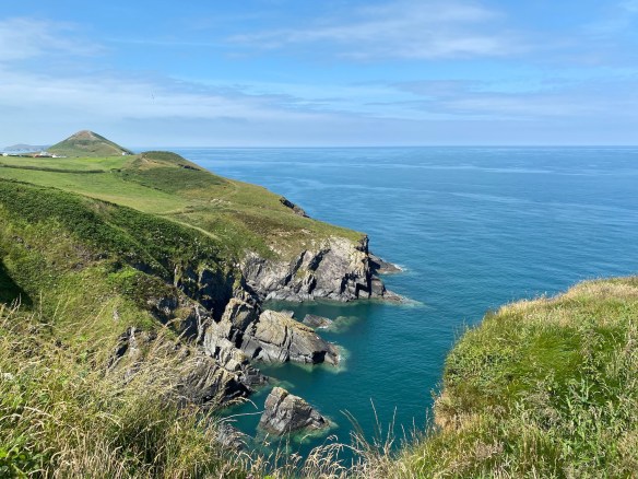 Soon we reach the coast at Traeth (beach in Welsh) Gwyrddon and turn left along the cliffs. The path now plunges up and down into small steep valleys with the inevitable haul up the other side. It is very hot – this is the beginning of a five day heatwave which will make the following days walking a little difficult. At one point I stop to catch my breath and take a photo of this strange grassy pyramid in the distance.
