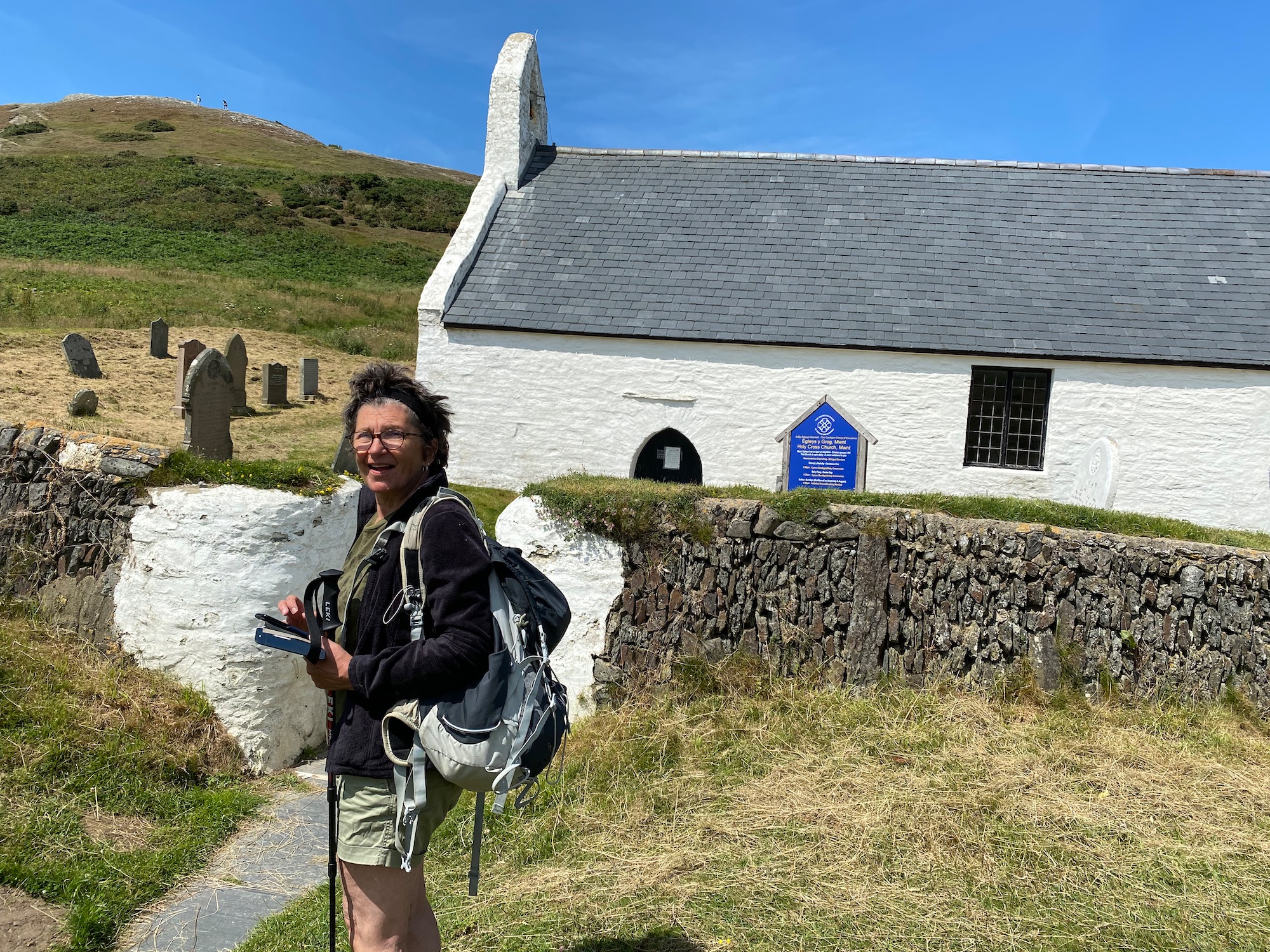 We are now getting closer to the grassy mound which turns out to be a steep conical hill marked on the map as Foel y Mynt. At the foot of the hill is a pretty white church, built in the 14th century as a place of rest for sailors. It would be a lovely cool place for us to shelter from the scorching heat but it is unfortunately locked.