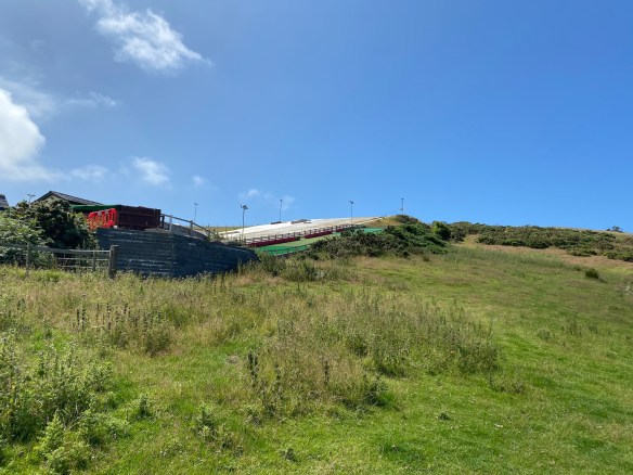 This does not last long however and soon the path narrows, winding up and down and around the small inlets. At one point we walk past a dry ski slope which is named on the map as the Urdd Centre – all sorts of activities are on offer for groups of young people and families. The website makes it look very exciting and what a location.