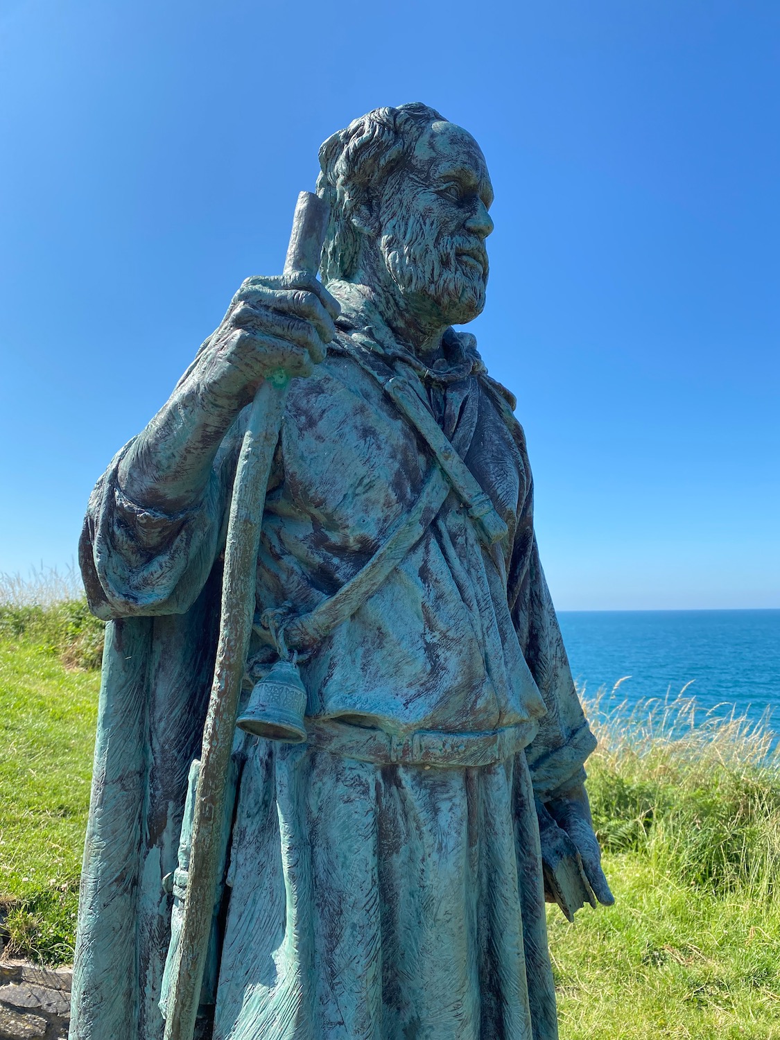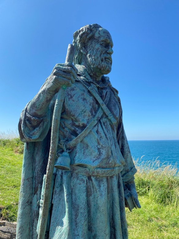 We walk across the beach resisting the urge to wrench off hot heavy leather boots and find ourselves up on the cliff in the company of St. Crannog, a sixth century saint who stands and watches over the village. This bronze sculpture is the work of Sebastian Boyesen who may be Scandinavian with a name like that but he is based in Wales and known for a number of site specific sculptures all over the country. The link below is for his website.