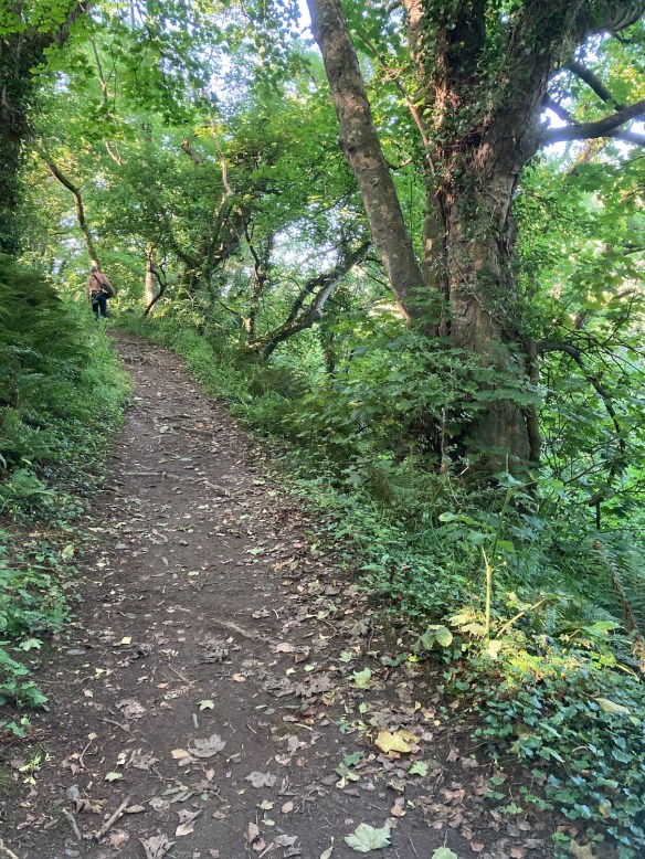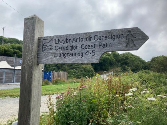 Following the signs for the Welsh coast path we walk behind the toilets and up into woodland. Llangrannog is probably a good place to stop for lunch.