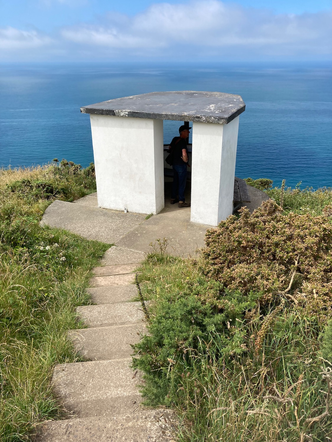 After a bit of a meander we find the path again and continue up along the cliffs. From here on the walk is beautiful with wonderful views. At one point the path branches off down some steps to a lookout station which we’re told is a good place for dolphin spotting. Inside there is a bench and posters of sea birds and other wild life – we stop for 5 minutes but see no dolphins.