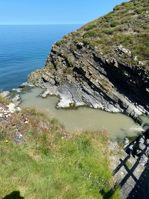 We come to a junction – a camping site in one direction and back up onto the Ceredigion Coast Path in another. It is easy walking along the top of the cliffs – time to appreciate the crystal clear sea below with its myriad hues of blue and green.