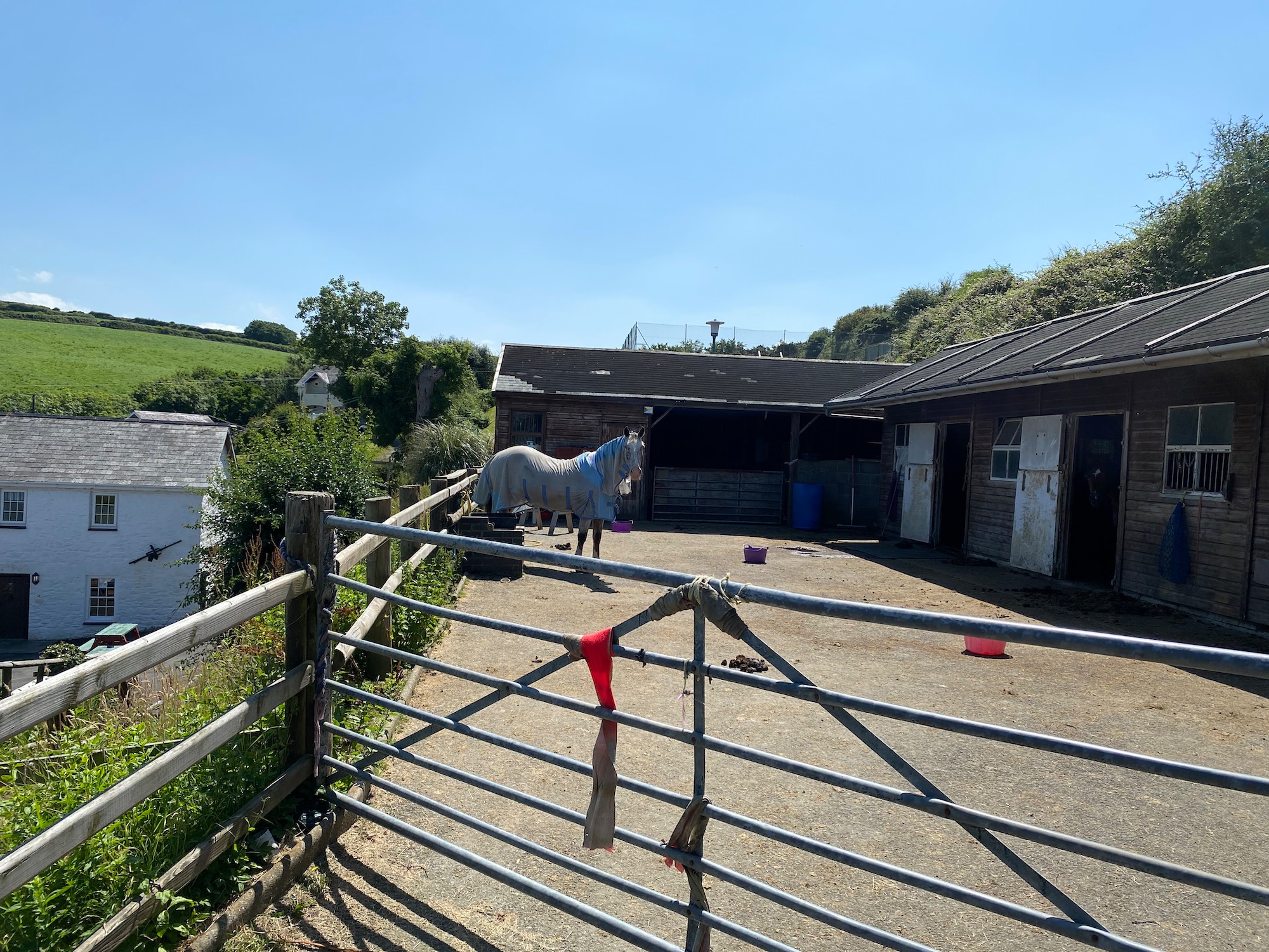 A little later we are approaching what looks like a holiday village named Gilfach yr Halen on the map. There are stables at the entrance to the village where a horse stands wearily in the midday sun ……………why is it not inside in the shade?