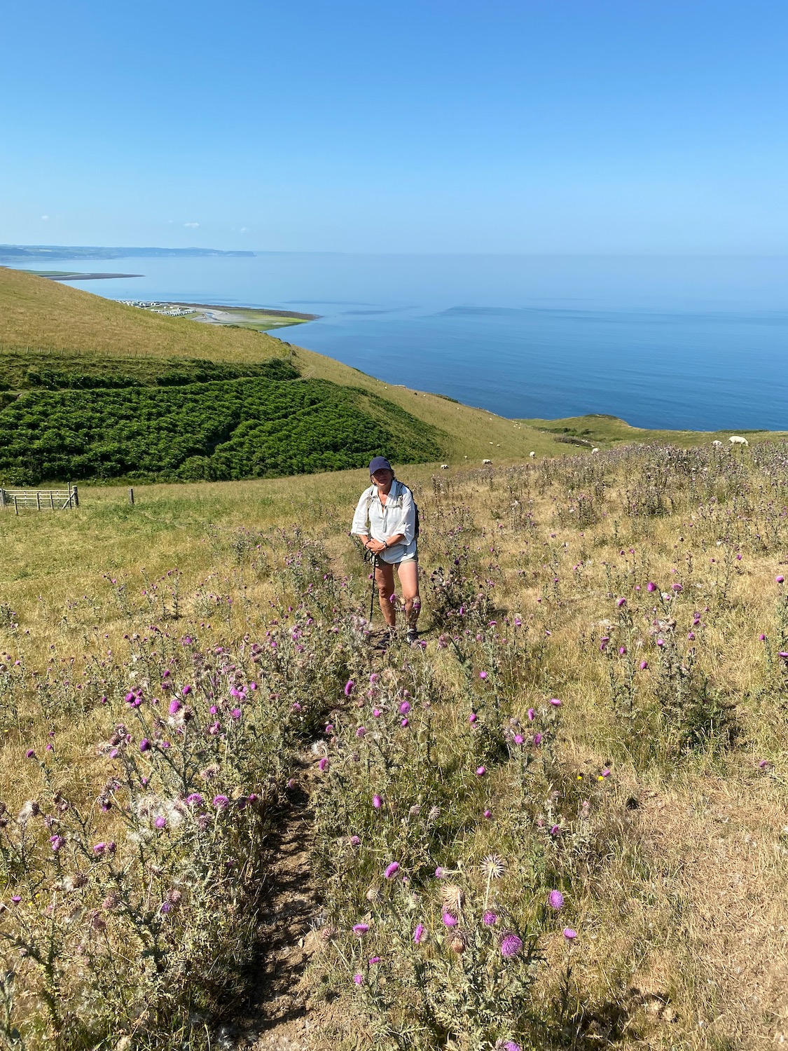 The climb up on to the cliffs is very very steep and to make matters worse we also manage to get lost in a field (yes – it can happen). We eventually rejoin the path which is now lined with prickly thistles – delightful when you’re wearing shorts.