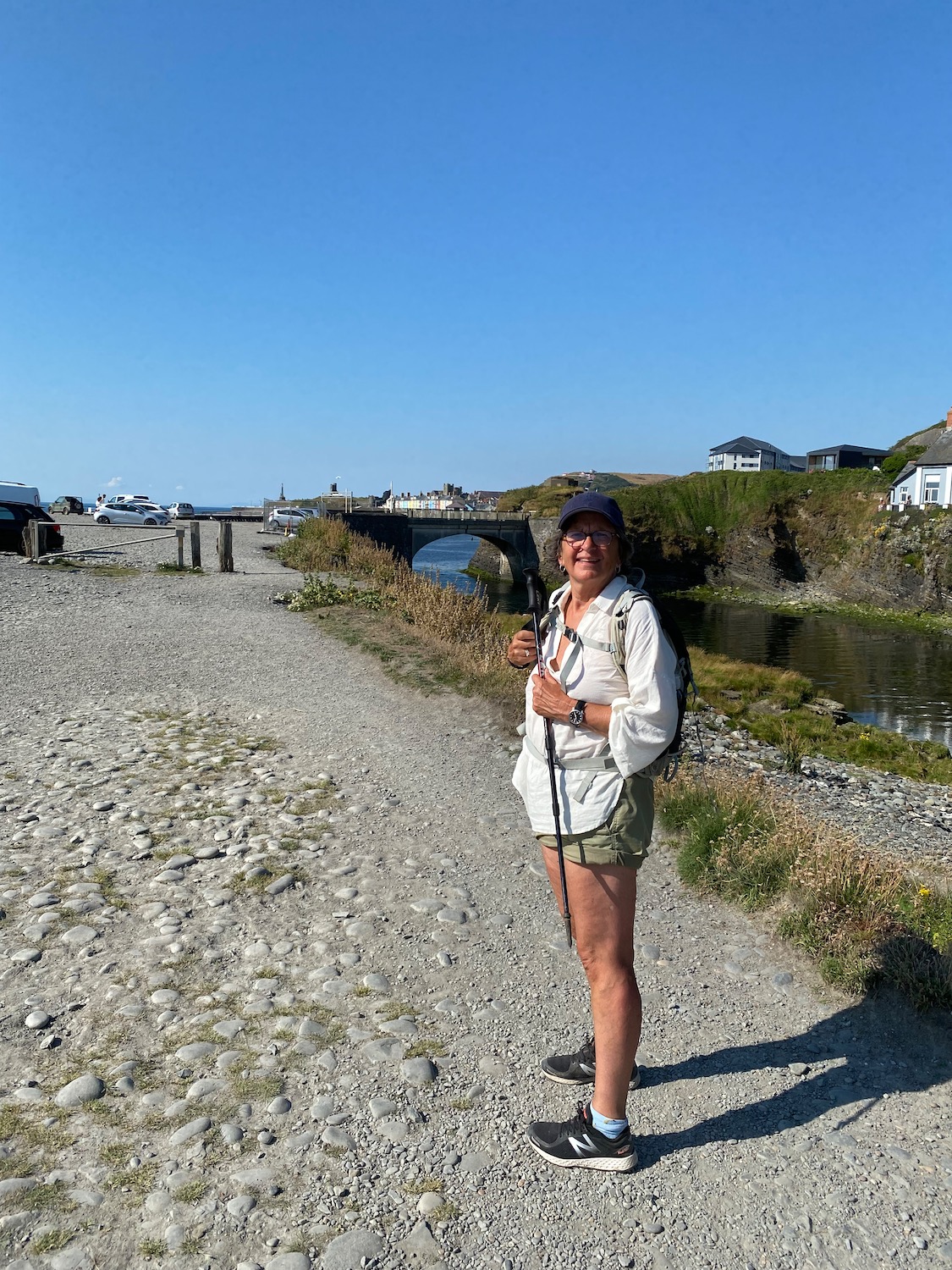 That sounds like a hot and at times a difficult walk. Beautiful blue sky/sea. Glad you found a pub at the end. Your legs look nice and brown!