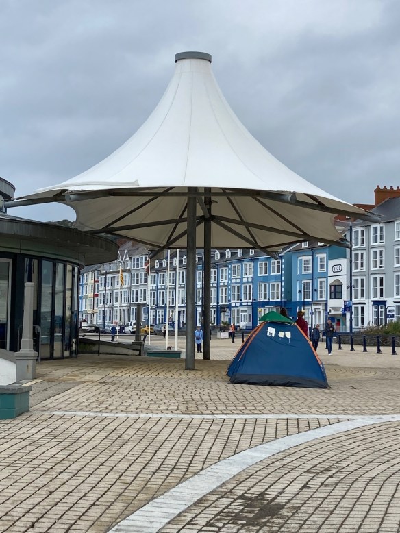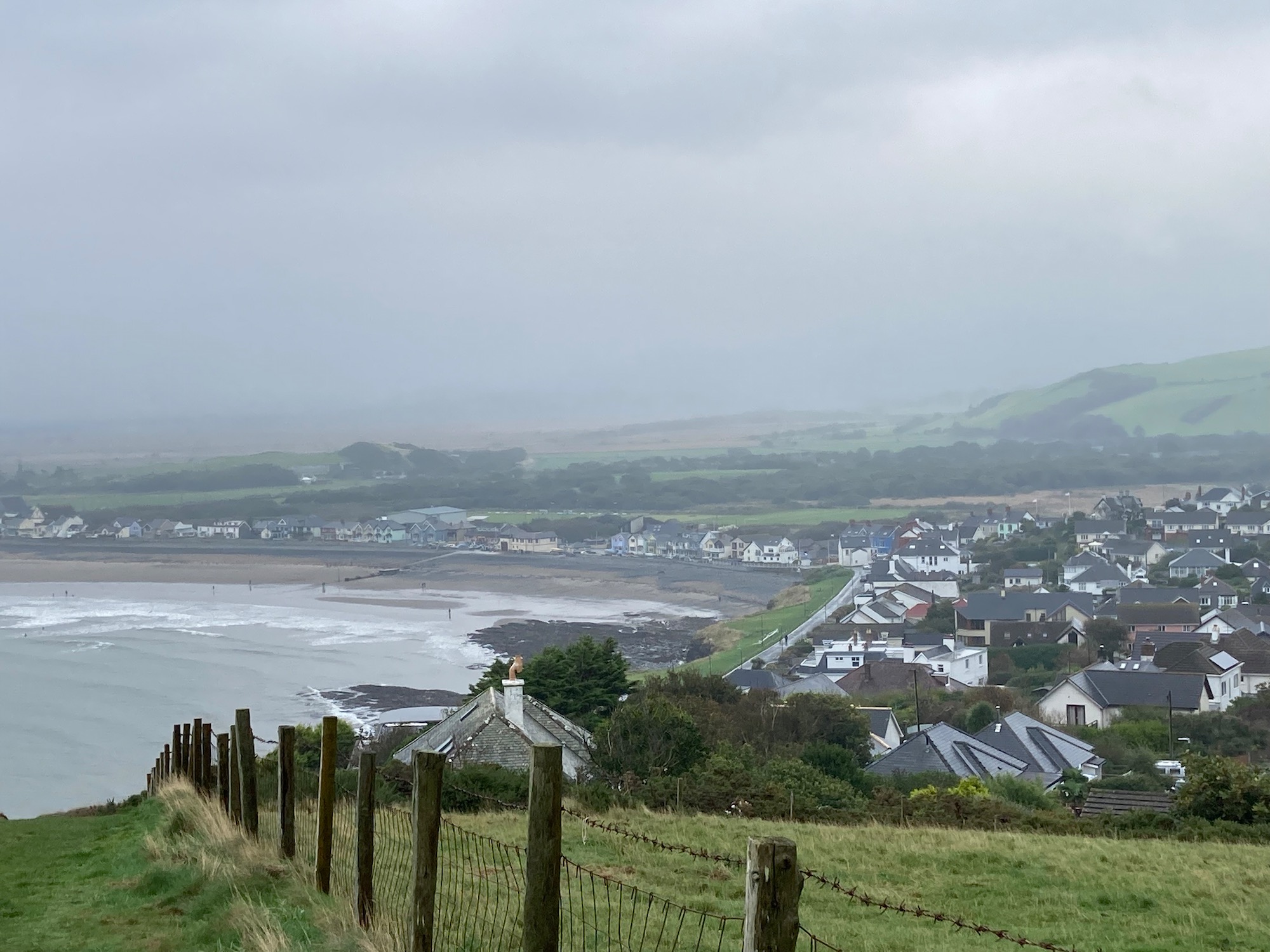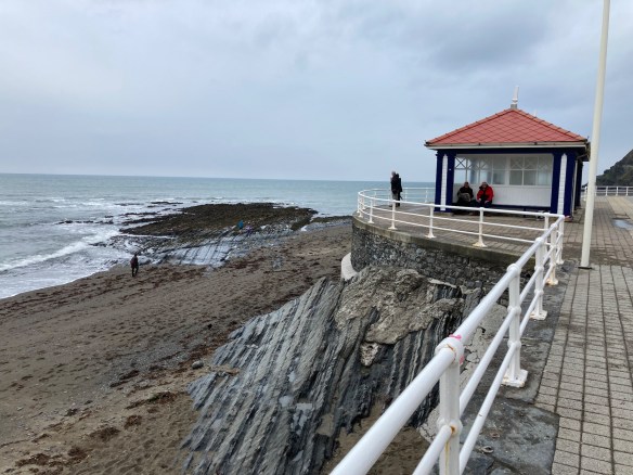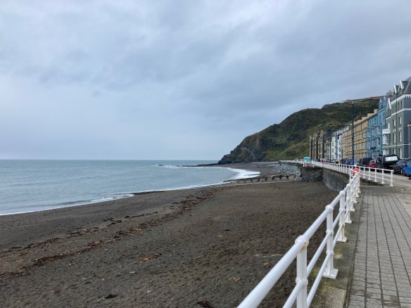Up on the cliff now the path follows the coast, up and down, quite steeply in places – I can feel I haven’t done any serious walking for a few months. In Clarach Bay we walk past acres of caravans – great for those who enjoy having a place by the coast but still a bit of scar on the landscape.