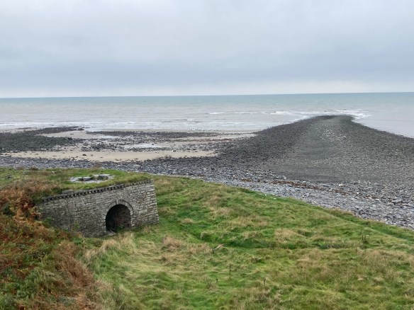The landscape around us now is wild and remote and the only building we see on our walk is a large white house overlooking Wallog Beach. From the beach a long pebbly groyne reaches out into the sea which is apparently completely natural and extends for miles. In the grounds are remains of a disused lime kiln. Lime was shipped to the beach to be treated and then spread over the fields of the Wallog Estate.