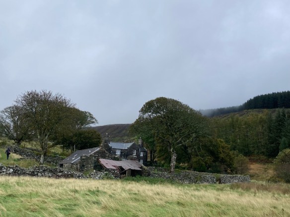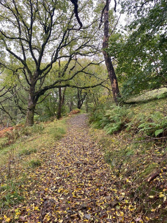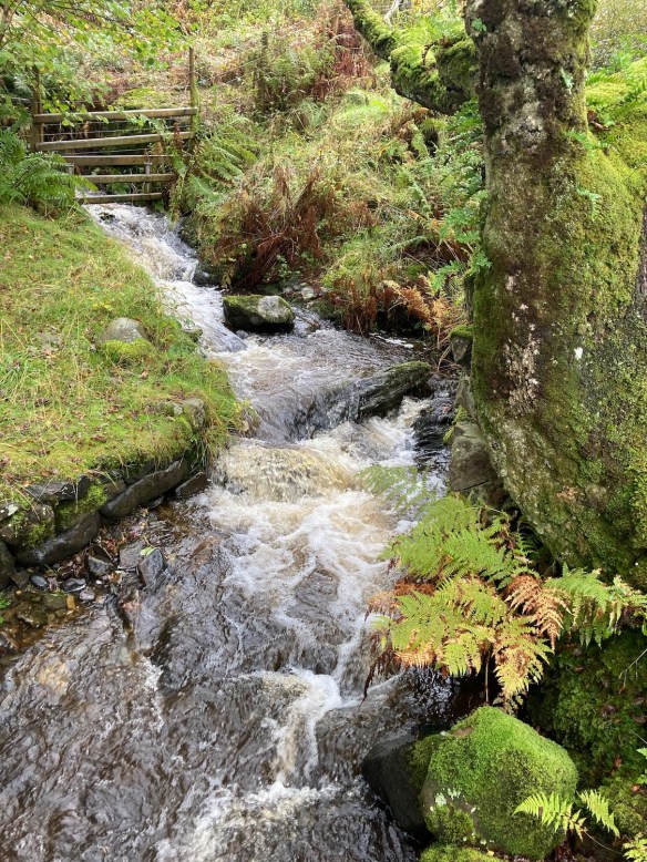 This part of the walk is lovely, despite the rain. Autumn leaves soften the path as we walk across streams in full spate, tip toeing across wobbly stepping stones.