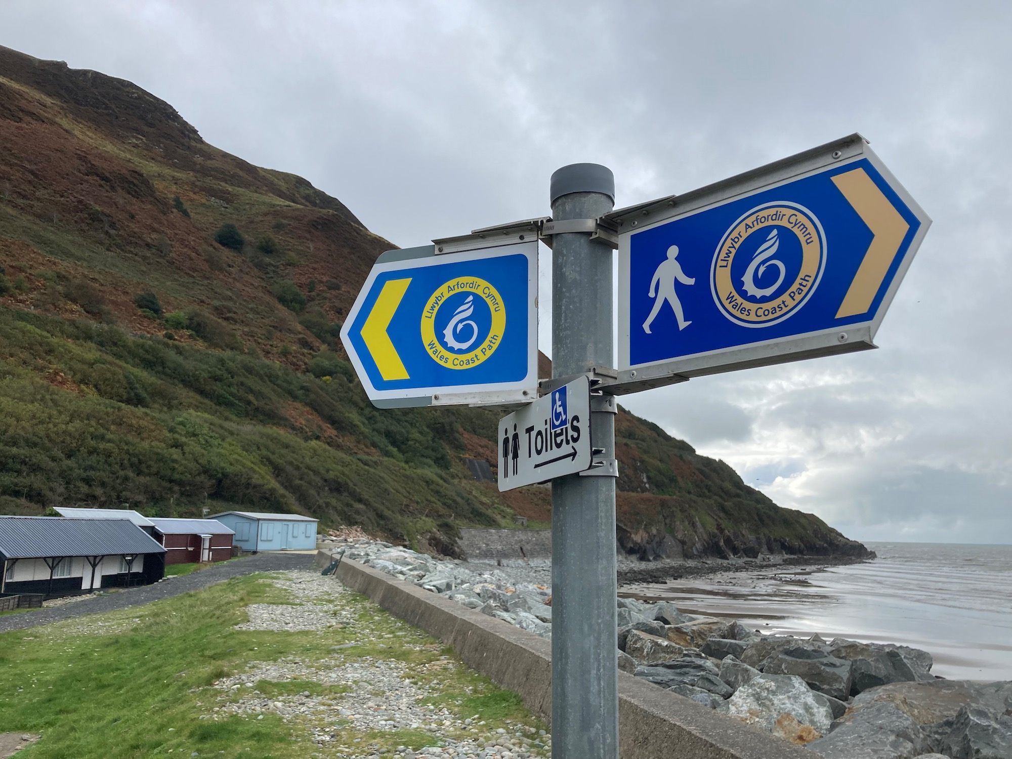At the end of the beach stands the cheery Welsh Coast path sign directing us left, under a railway bridge and up onto the main road.