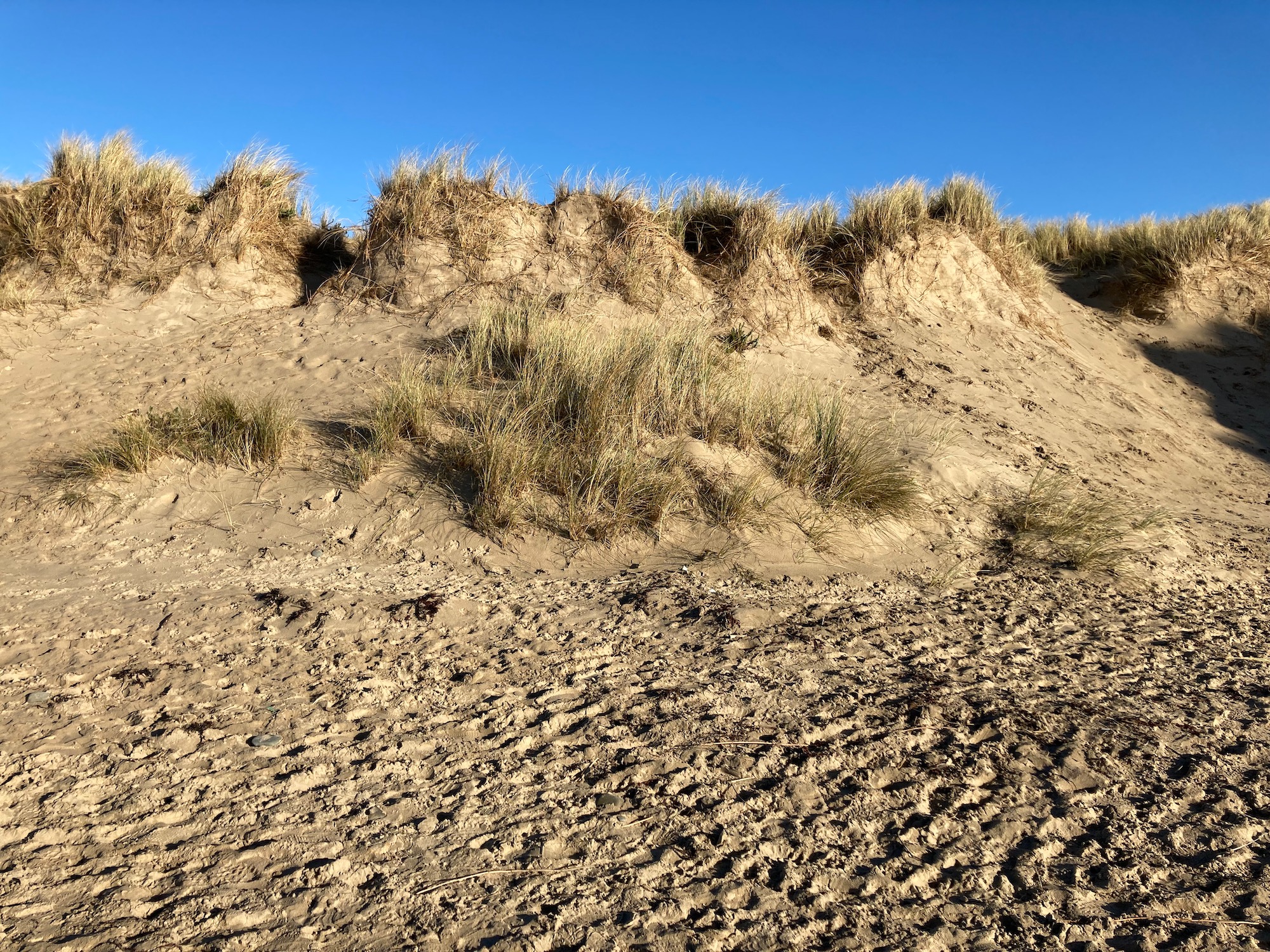 A long stretch of golden sand beckons and it is a beautiful day. The beach is fringed with sand dunes and as we walk they get higher and higher.