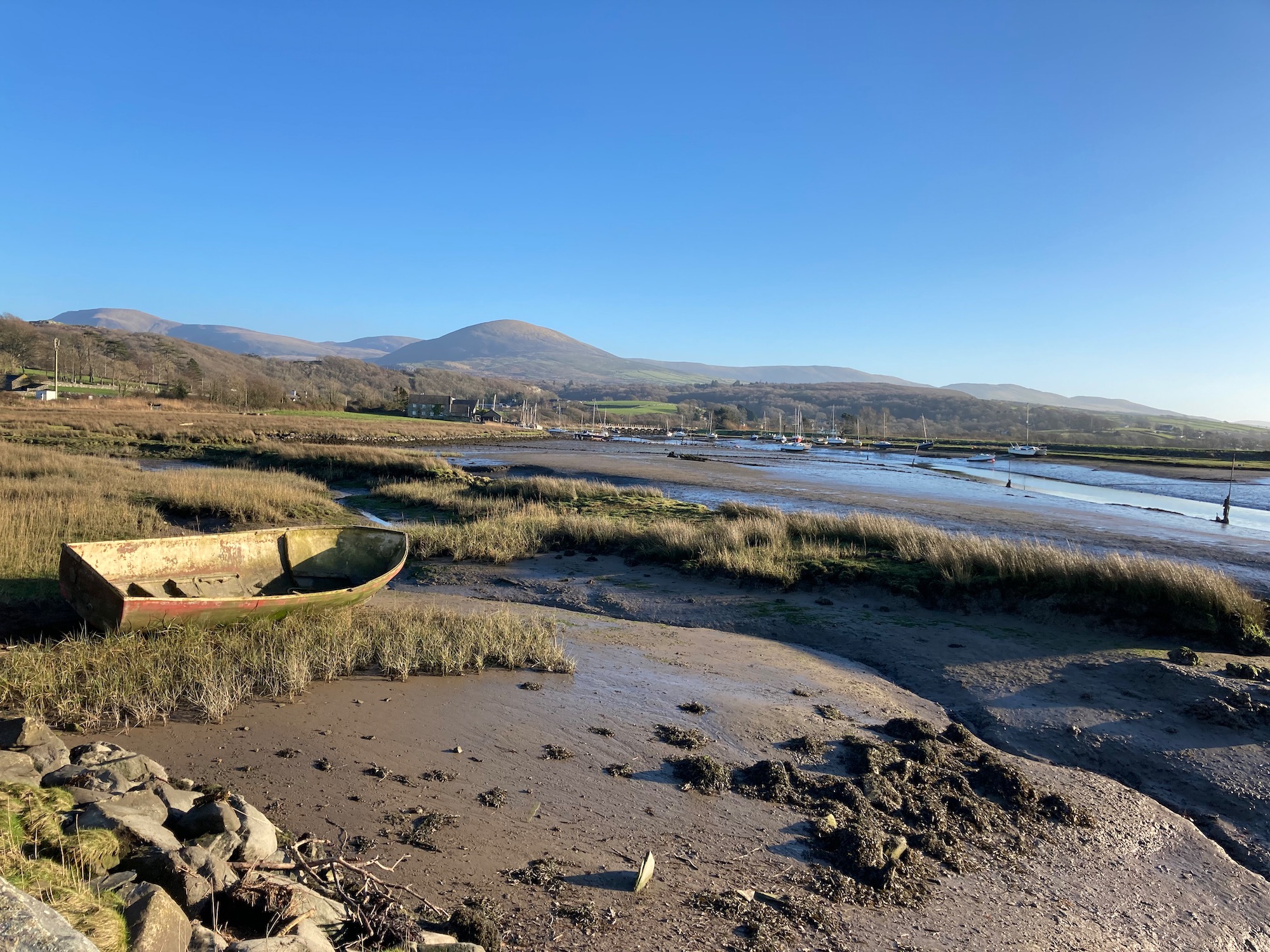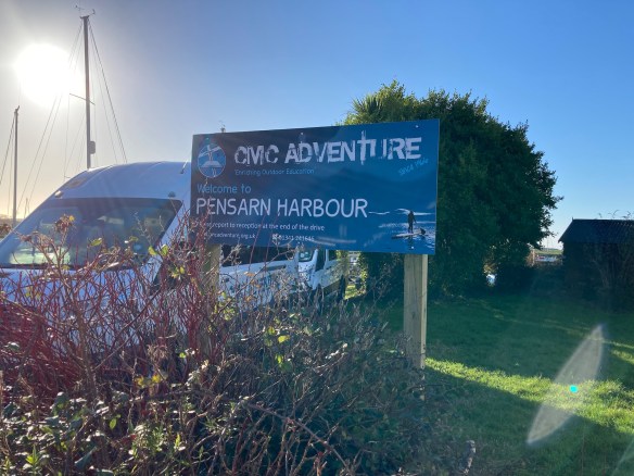 We walk through a group of enthusiastic young people gearing up to some water sport or other, into a soggy field overlooking the harbour. There are some large rocks marking the small slope down to the water so we decide to avail ourselves of these and stop for lunch. The sandwiches are as soggy as the landscape but we wolf them down – there’s nothing better than eating in the open air when you’re hungry after a morning of walking.