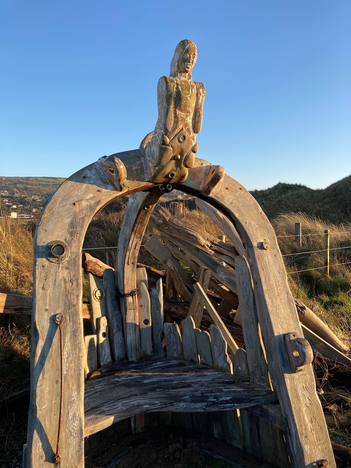Lovely blue skies for your walk. Never heard of Shell island before.Interesting statues! I think the first one must be from a ship. Shame the castle was closed. Another nice walk on the sandxx