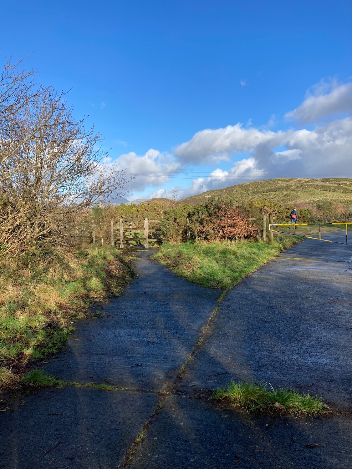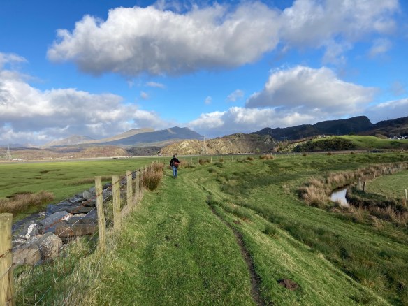 Anyway, after leaving the car in the station car park at Porthmadog we take the coast train to Harlech and start walking northwards. The terrain is pretty featureless, one flat field after another until we hit the concrete service road for the recycling centre at Morfa Harlech – yahoo!