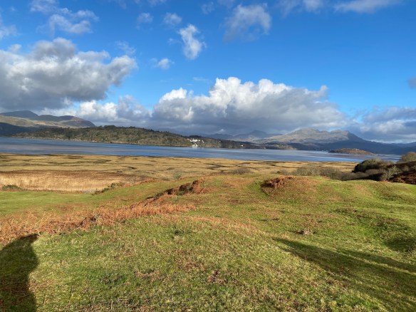 From here the path winds up through scrubby heath which then gradually turns into marshland the nearer we get to the coast. It’s not that clear but you can see Portmeirion across the estuary (the white buildings in the distance).