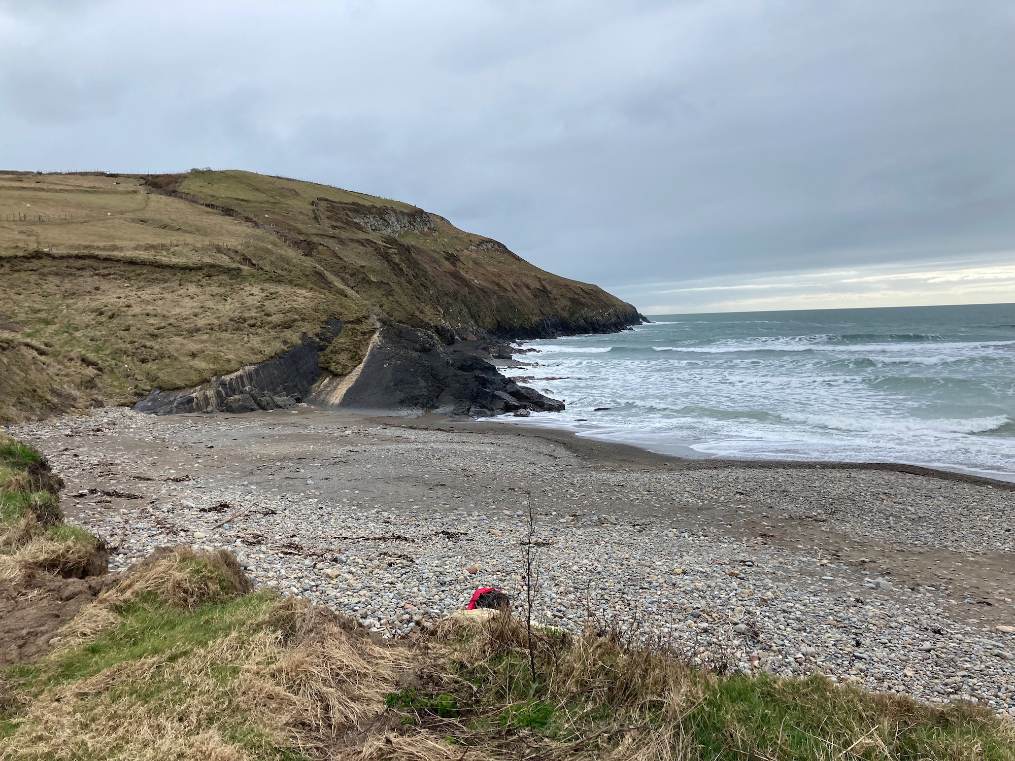 …….and from here it’s a nice uncomplicated tarmac road down to the carpark at the eastern end of Porth Neigwl beach. Known to the locals as “Hell’s Mouth” this is a long curving, almost semi-circular bay which the Welsh Coast Path avoids, perhaps because it is known for its ferocious winds and dangerous swimming conditions. The label “Hells Mouth” either derives from the physical relief of the bay, which can look like an open mouth, or the fact that this area is thought to have been the scene of as many as 30 shipwrecks over the last 180 years.