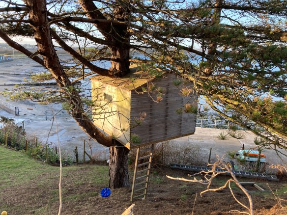 Very, very tired we reach the stony beach at Machroes and walk alongside the golf course into Abersoch. I have just enough energy to stop and take a photo of this wonderful tree house.