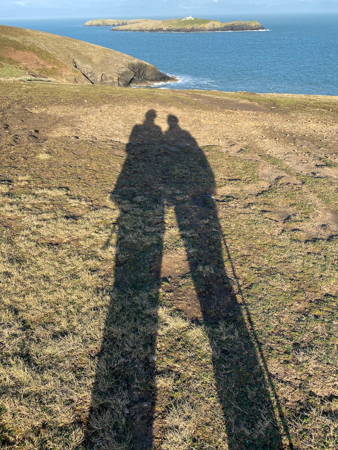 After a couple more miles we turn the corner at Trwyn yr Wylfa and celebrate with a sort of selfie, making use of the long shadows of late afternoon. The two islands are St.Tudwal’s East and West, named after St. Tudwal who travelled to Ireland to learn the scriptures, and then became a hermit on the Eastern island, where remains of a priory can still be seen.